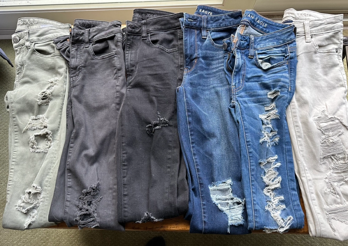 Six pairs of American Eagle distressed skinny jeans. Various washes including light grey, dark grey, black, dark wash blue, and a light olive green. Excellent pre-owned condition. Size 00.
