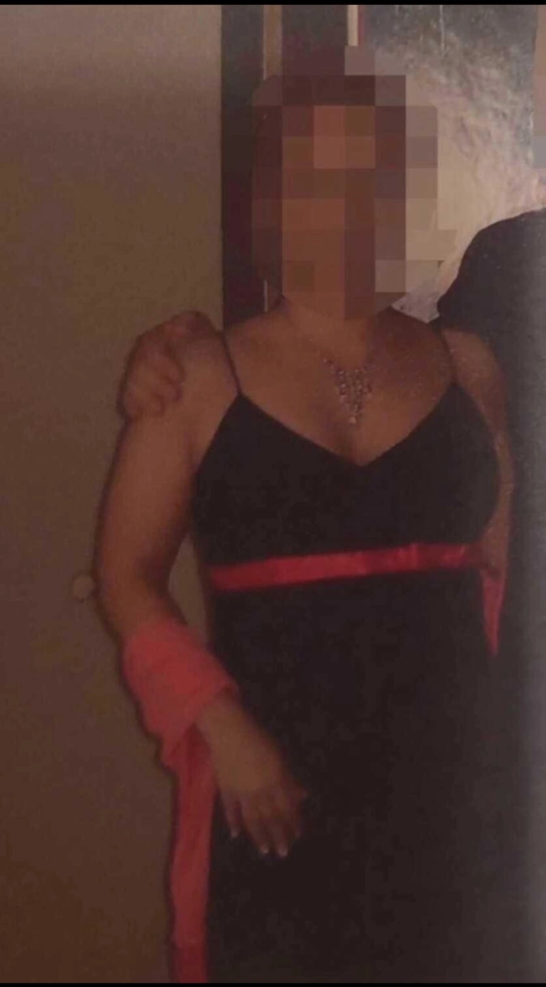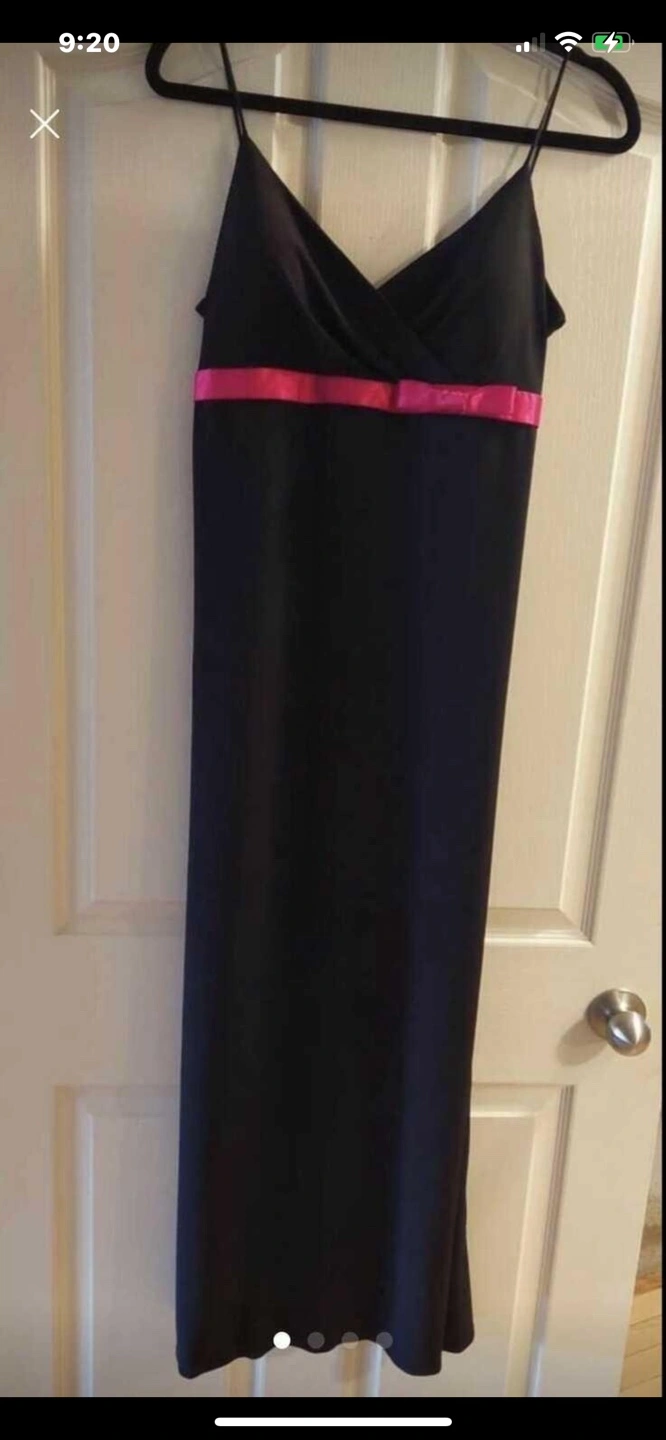 Beautiful black dress. Features a pink ribbon accent, Spaghetti straps. Floor-length. Great for a formal occasion.