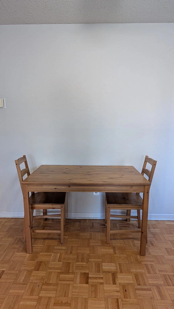 Solid pine wood table and two matching chairs. Simple design, great for small spaces.