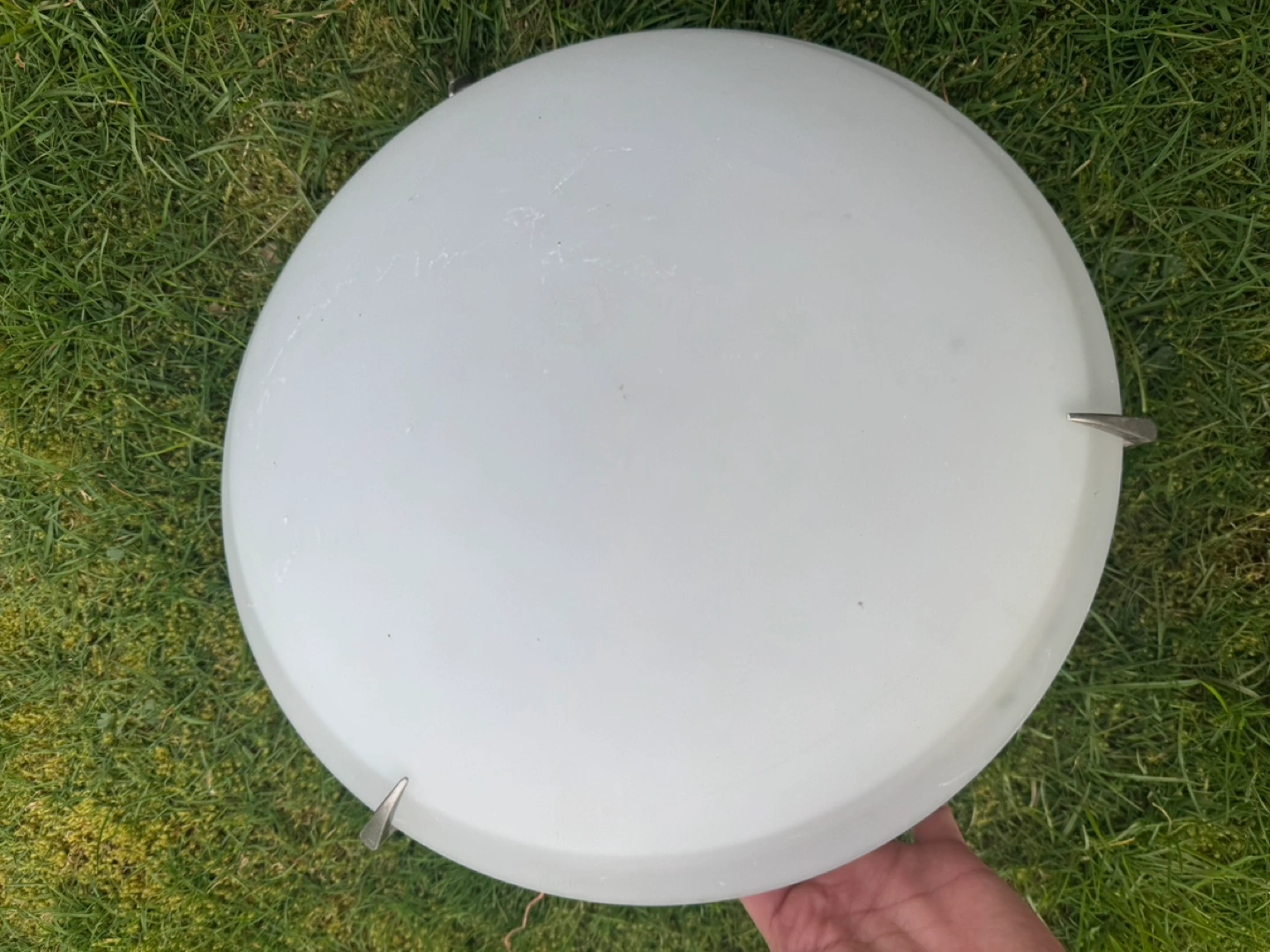 90Round ceiling light fixture. White plastic cover. Some minor surface imperfections. Wiring visible in images. Used condition. Sold as is.