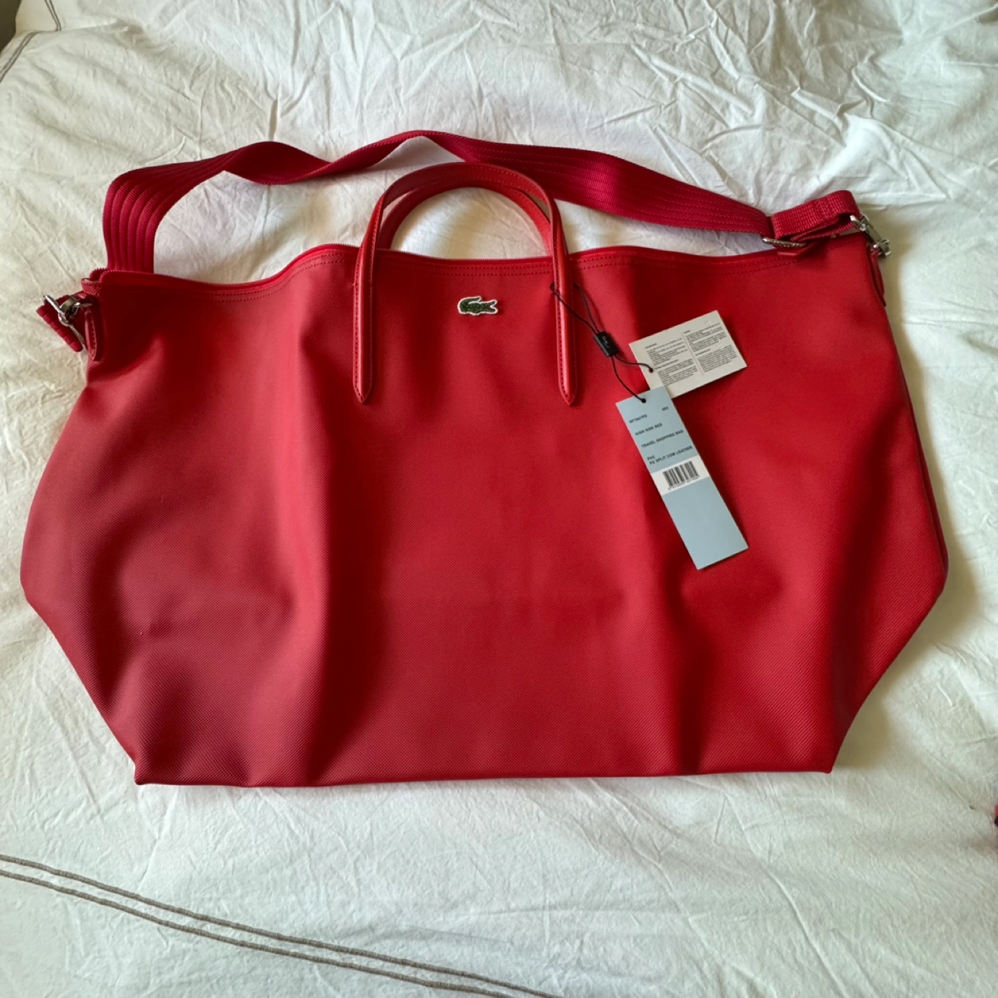 Large red tote bag. Features a zipper closure, inside zipper pocket, and adjustable shoulder strap. Made of PVC and PU split cow leather.
