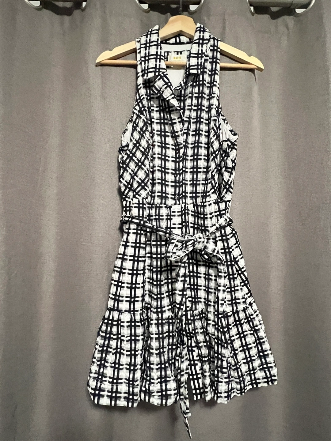 Dress from Anthropologie. sleeveless collared dress. Features a button placket, a self-tie belt, and a tiered skirt. Black and white gingham pattern. Worn only once.