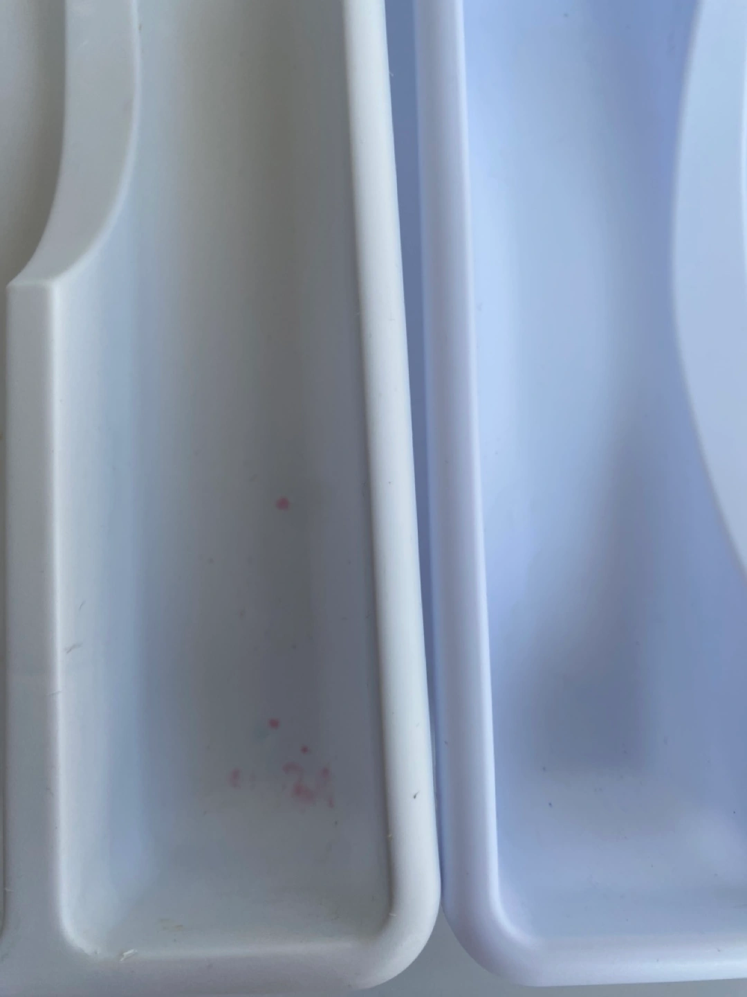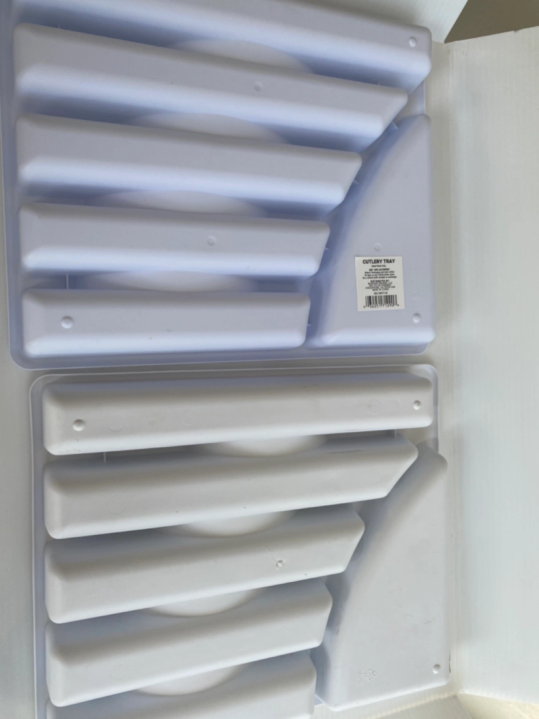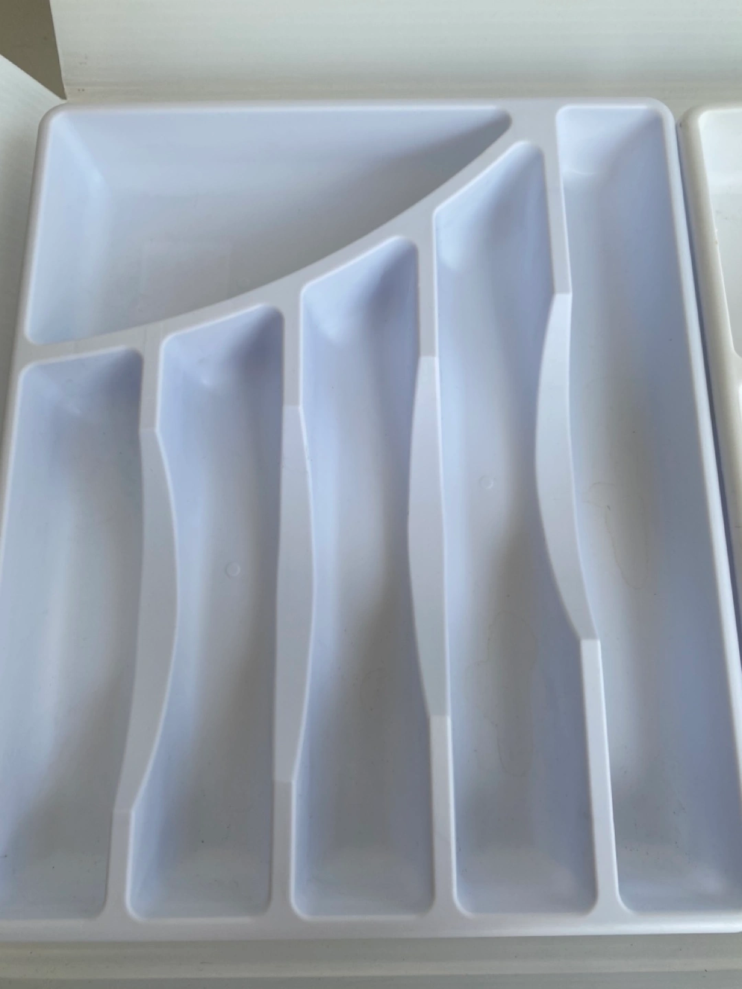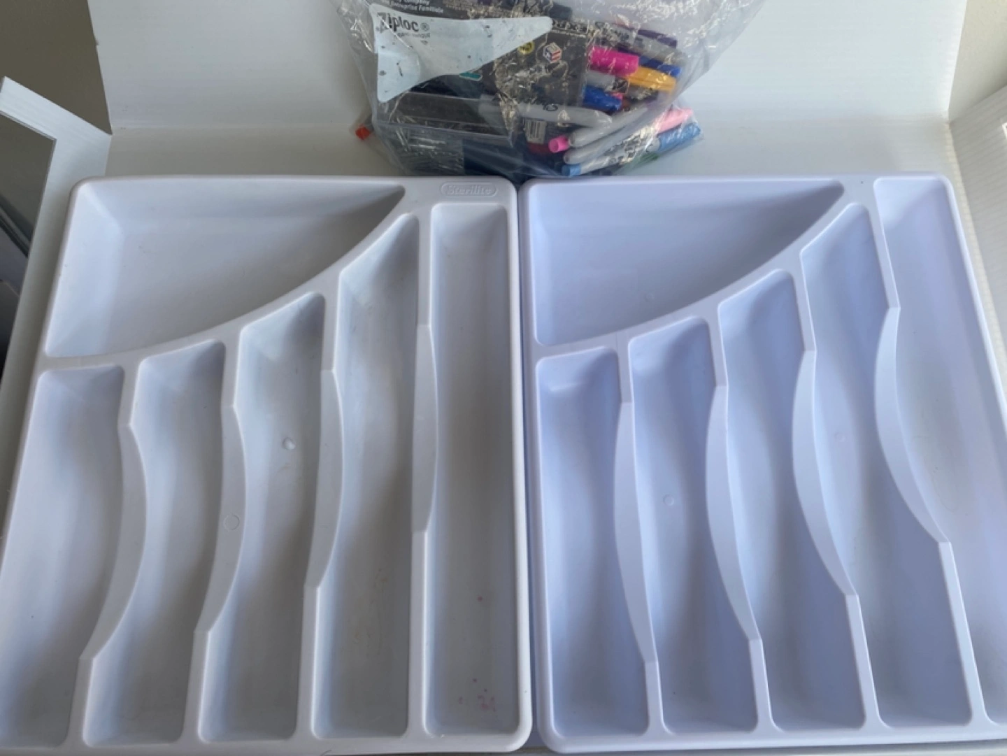 2 used cutlery trays. One is a Sterilite and one from Family Dollar. Dimensions are 14in x 11⅞in x 1⅞in. These were used for art supplies, they are too big for our kitchen drawers. Please look at pictures closely to see ink stains.