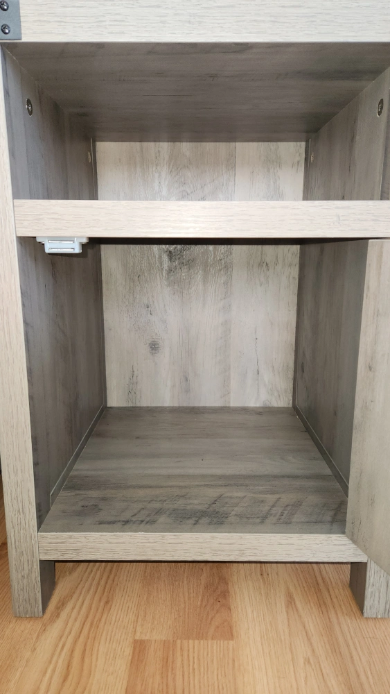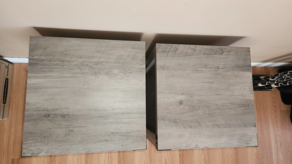 Two matching nightstands. Grey wood finish. Open shelf and cabinet with door. Metal accents. Good condition.