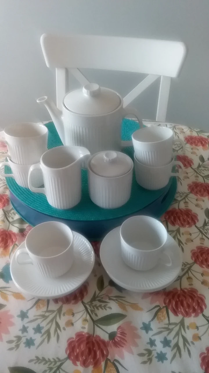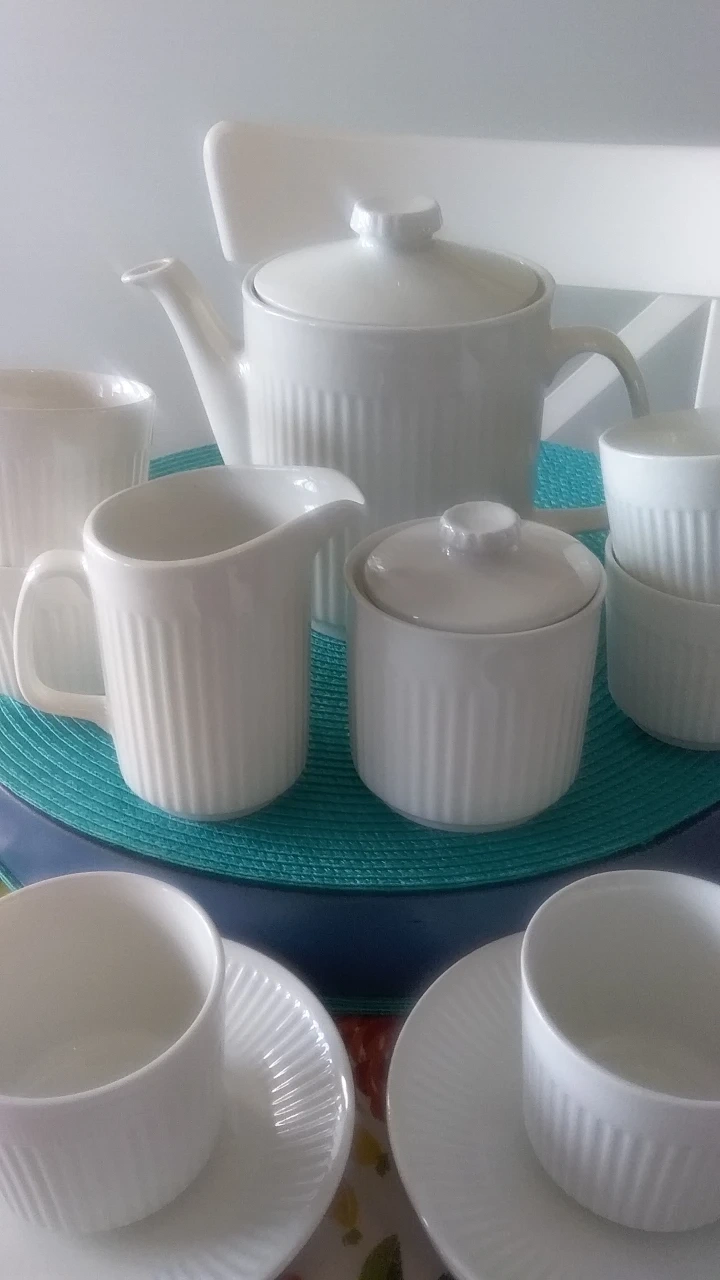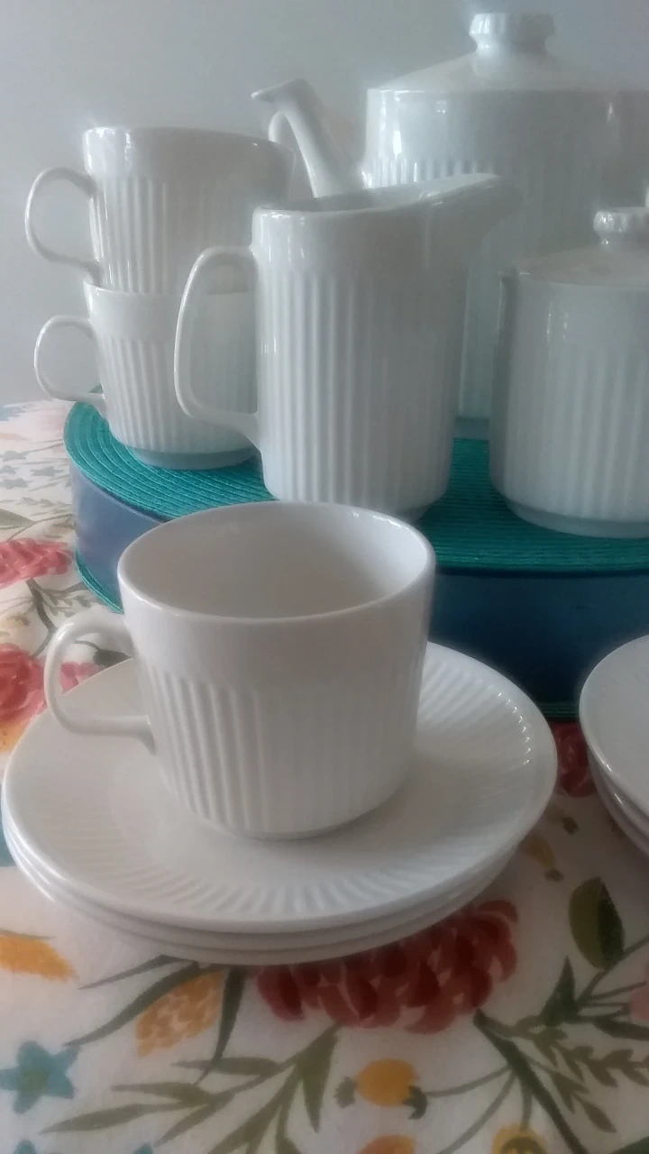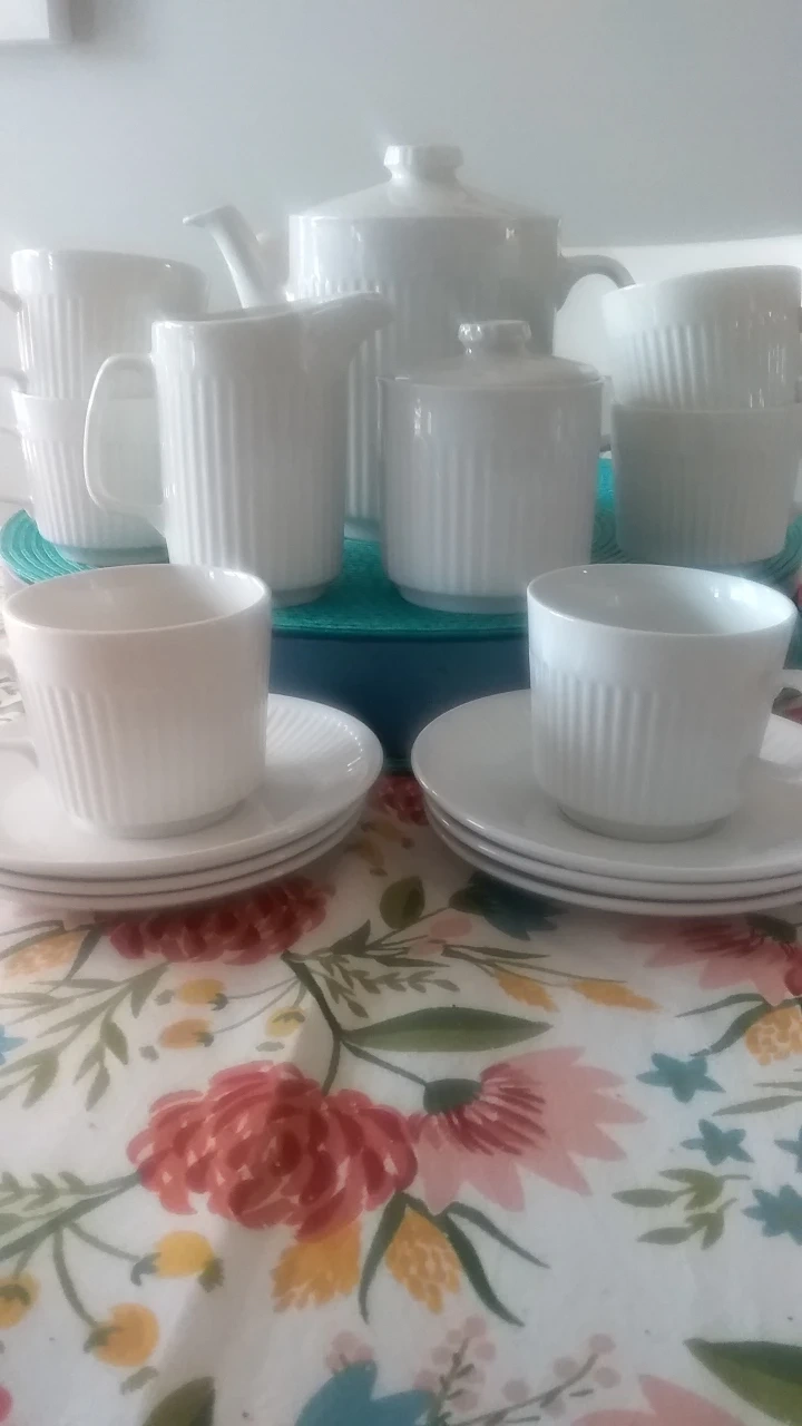 Johnson brothers Athena Elegant vintage tea set. Includes teapot, creamer, sugar bowl, and six teacups with saucers. Features subtle ribbed detailing. White porcelain. Perfect for afternoon tea or a special occasion.