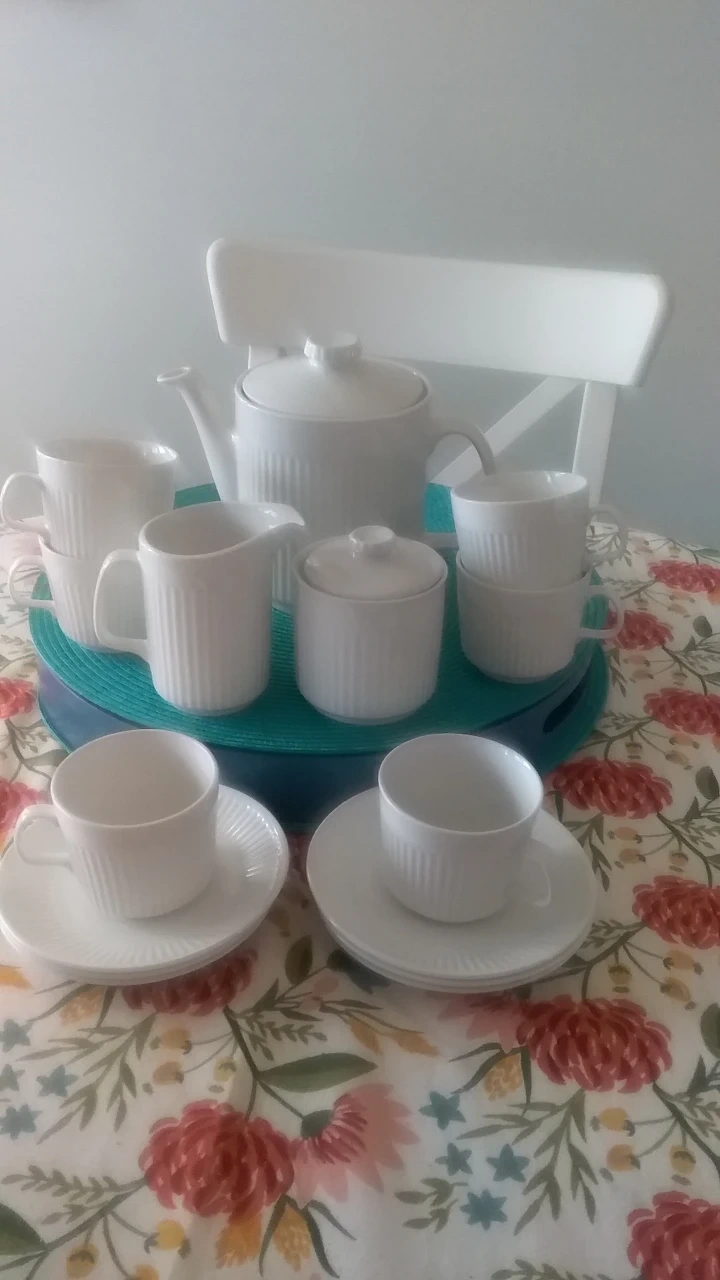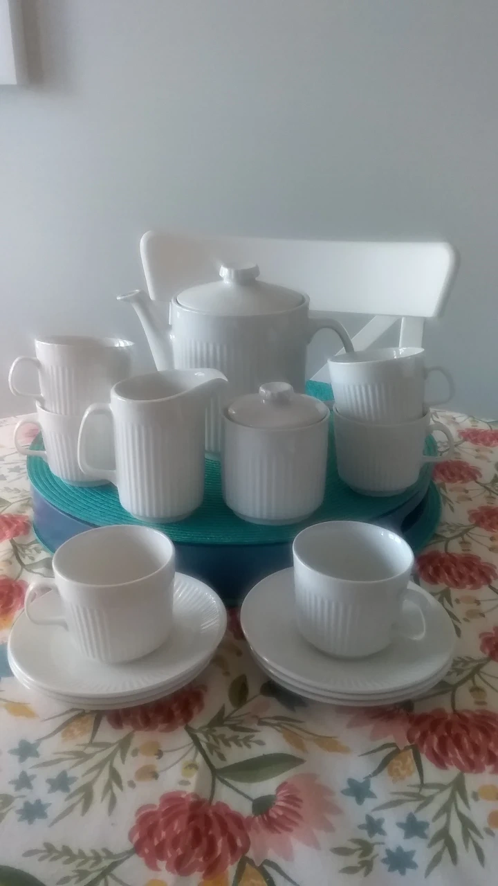 Johnson brothers Athena Elegant vintage tea set. Includes teapot, creamer, sugar bowl, and six teacups with saucers. Features subtle ribbed detailing. White porcelain. Perfect for afternoon tea or a special occasion.