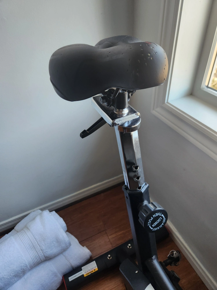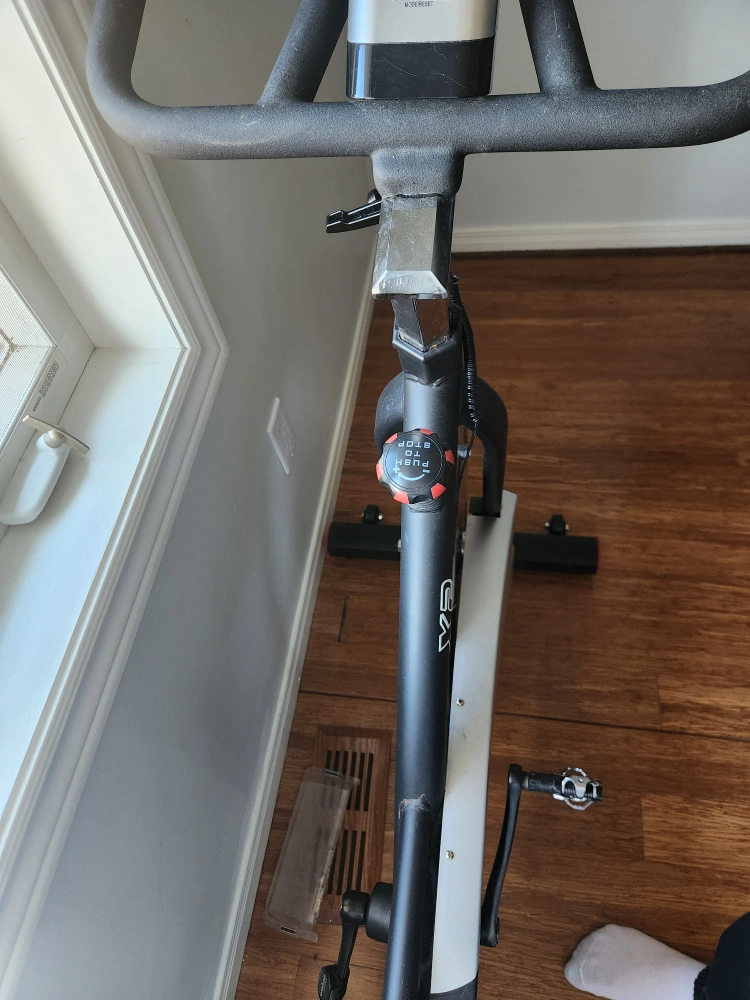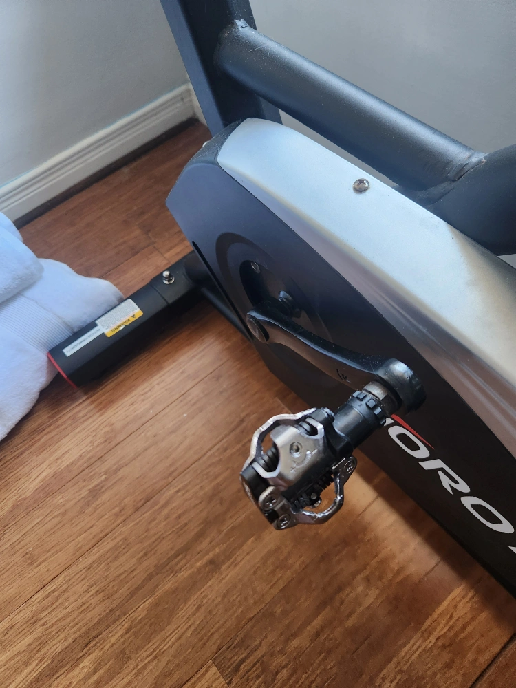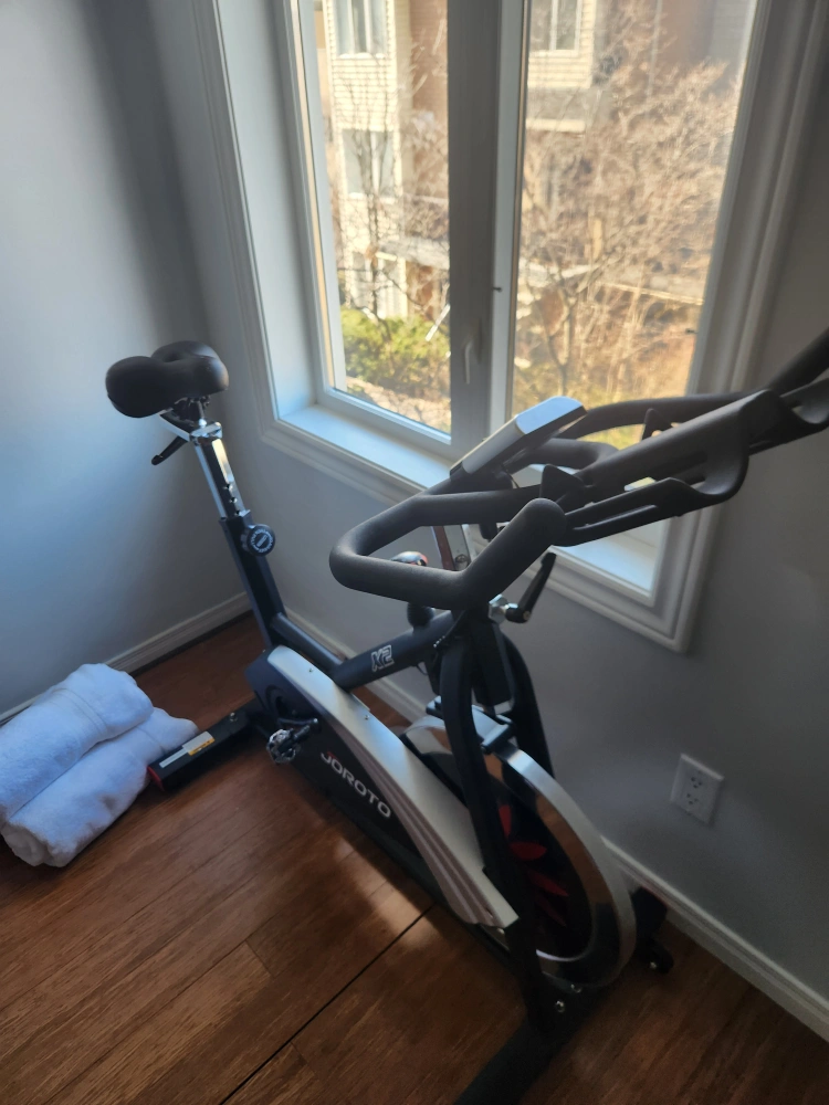 Used Joroto G2 indoor cycling bike. Features adjustable seat and handlebars. Clips for professional riding shoes installed. Digital monitor displays workout data. Some wear and tear visible.