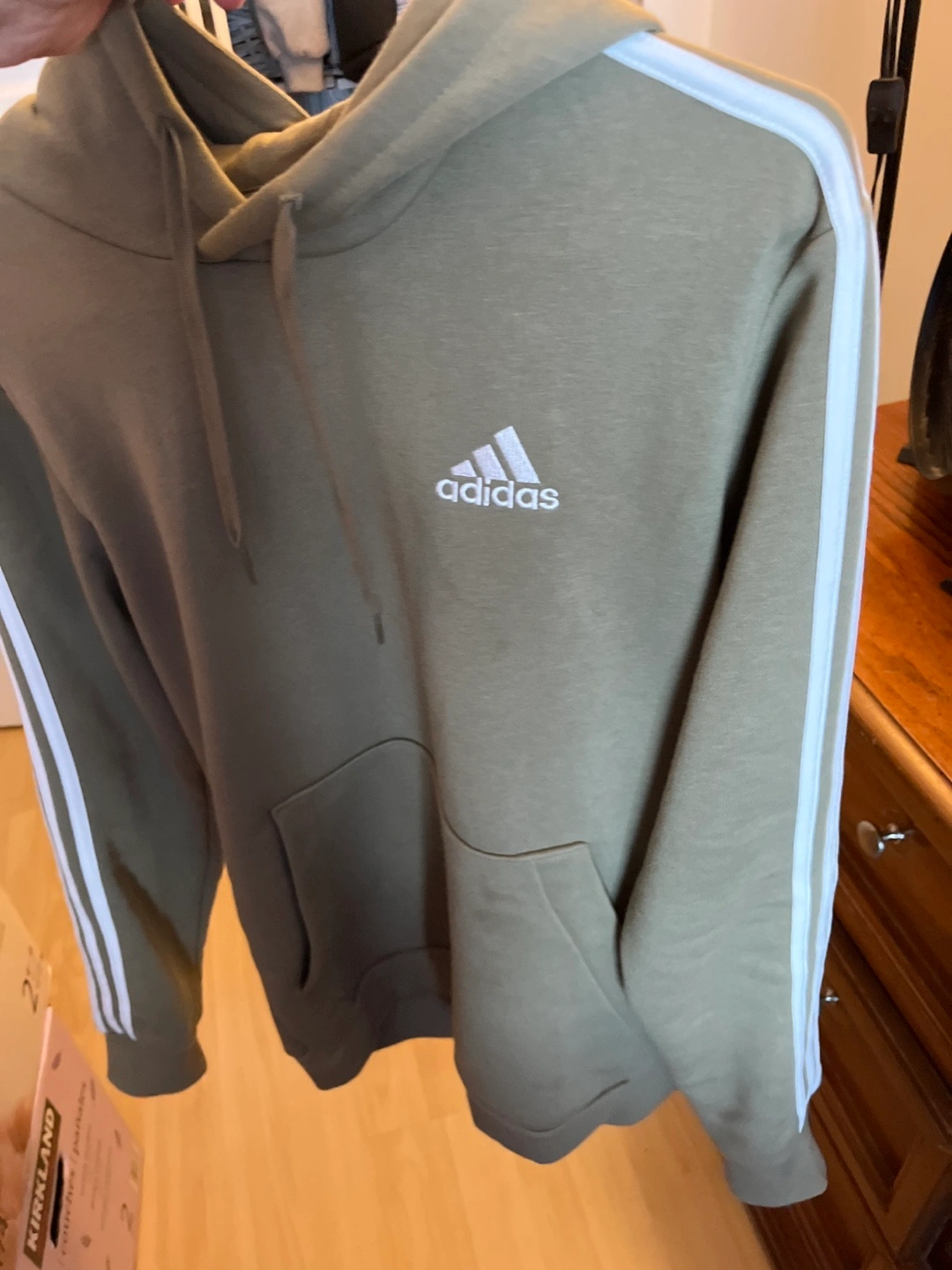 Men's Adidas hoodie. Olive green colour. Features white stripes on the sleeves. Kangaroo pocket. Drawstring hood.