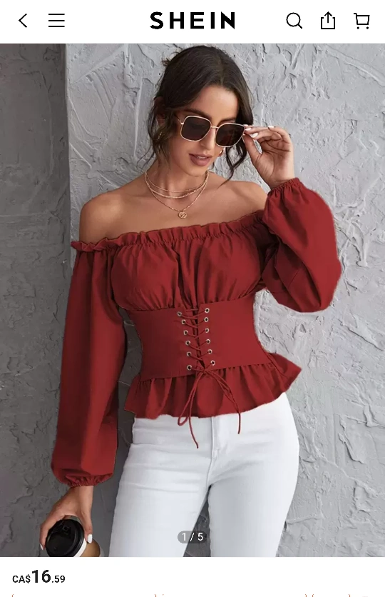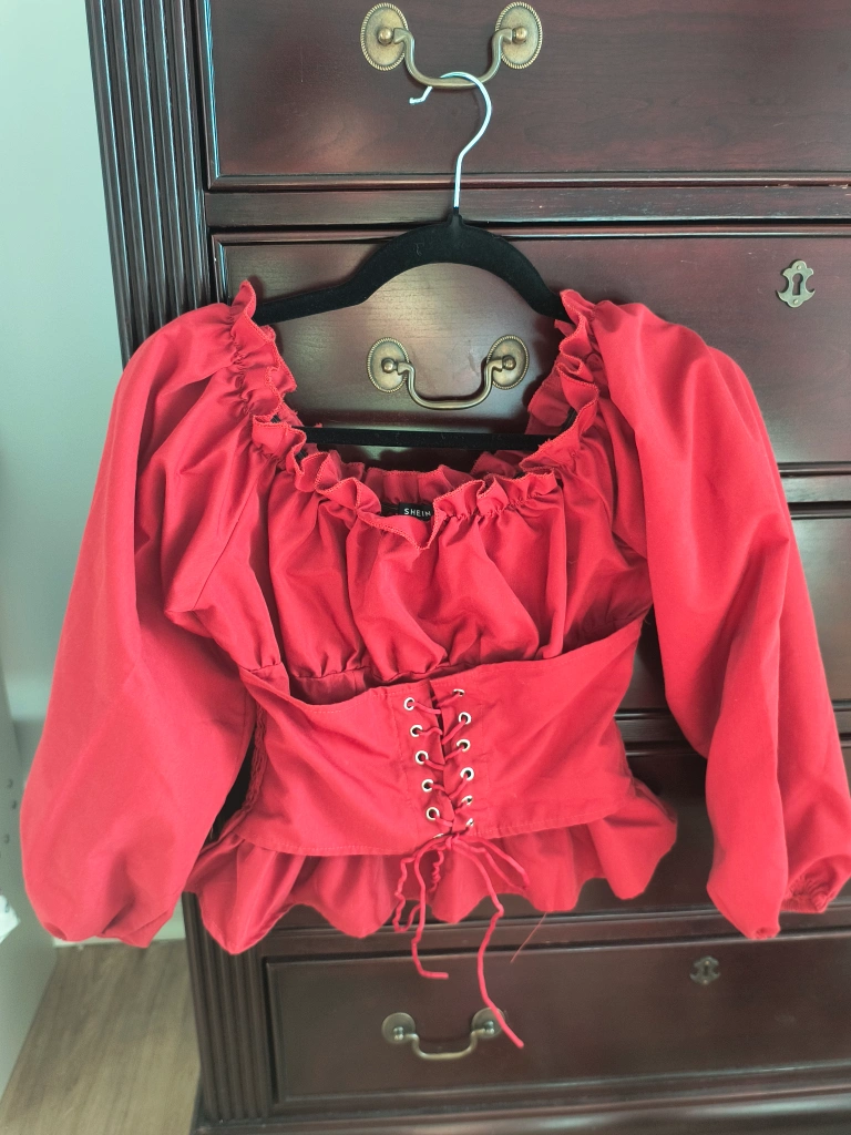 Beautiful red corset-style blouse. Off-the-shoulder design. Long sleeves. Back lace-up detail. Ruching at the bust and hem.