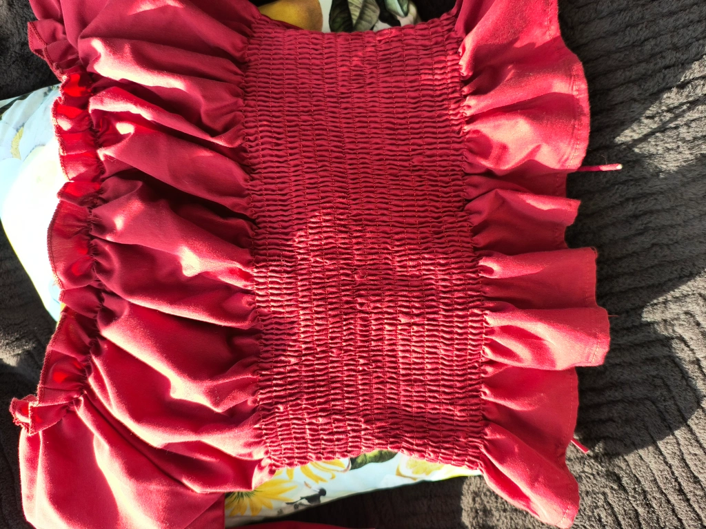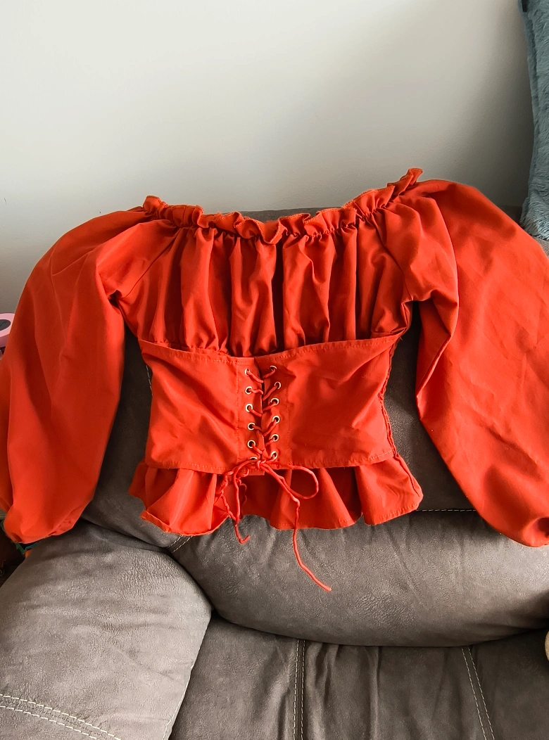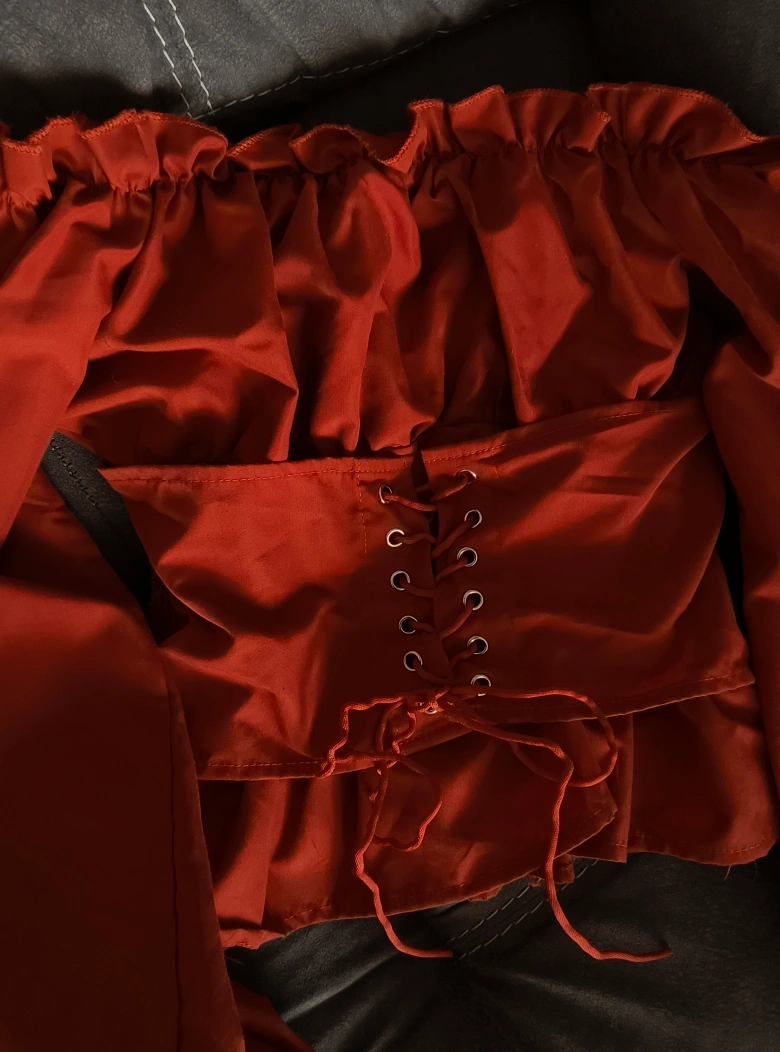 Beautiful red corset-style blouse. Off-the-shoulder design. Long sleeves. Back lace-up detail. Ruching at the bust and hem.