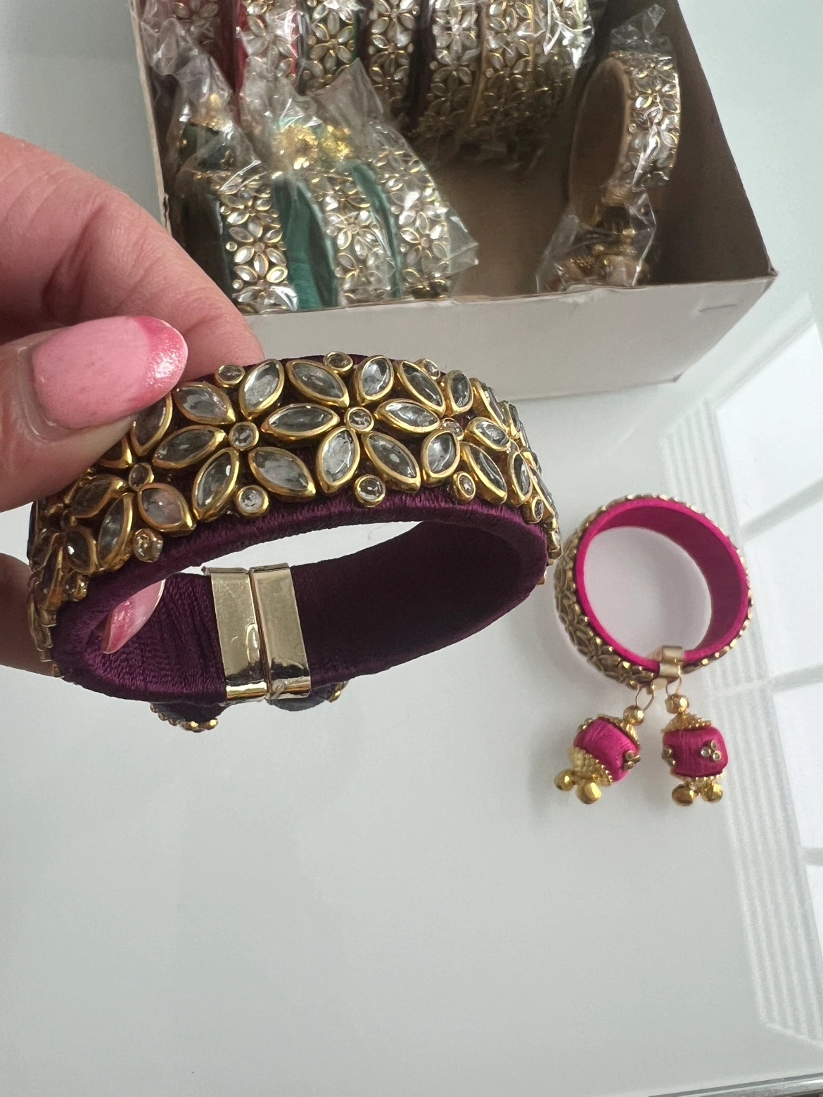 Brand new colourful Set of silk thread bangles. Various colours. Kundan and stone embellishments. Adjustable sizing. Includes additional bangles with dangling charms. Various styles. All together 30 pieces all for $ 22.00