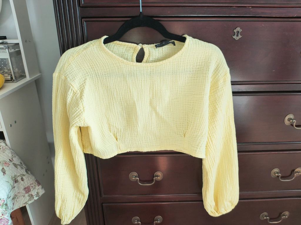 Pale yellow cropped long-sleeve blouse. Relaxed fit. Lightweight fabric. Round neckline with keyhole detail at back.