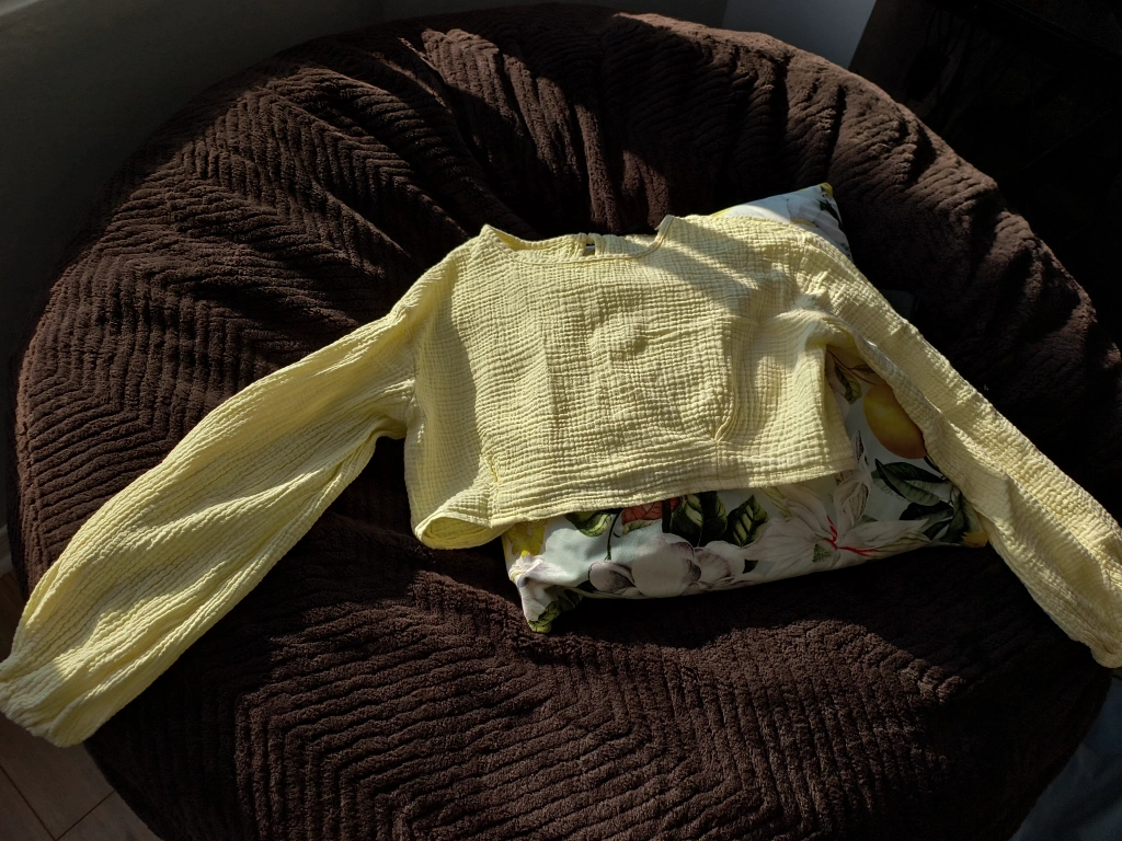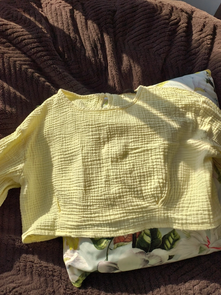Pale yellow cropped long-sleeve blouse. Relaxed fit. Lightweight fabric. Round neckline with keyhole detail at back.