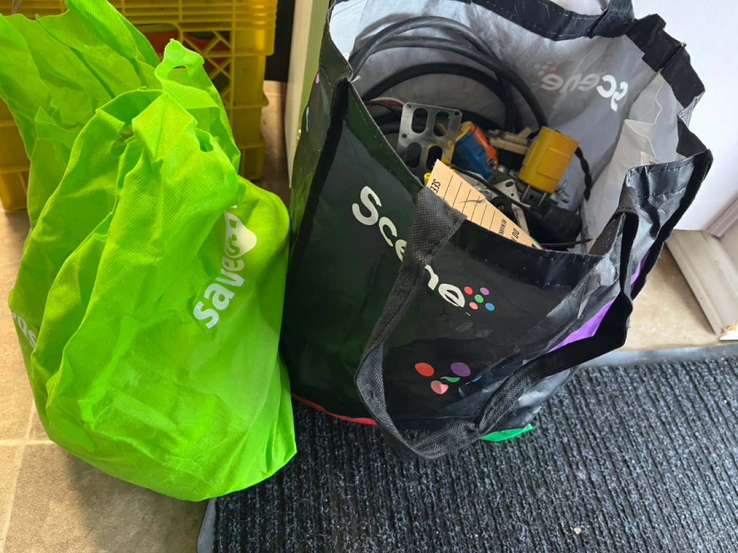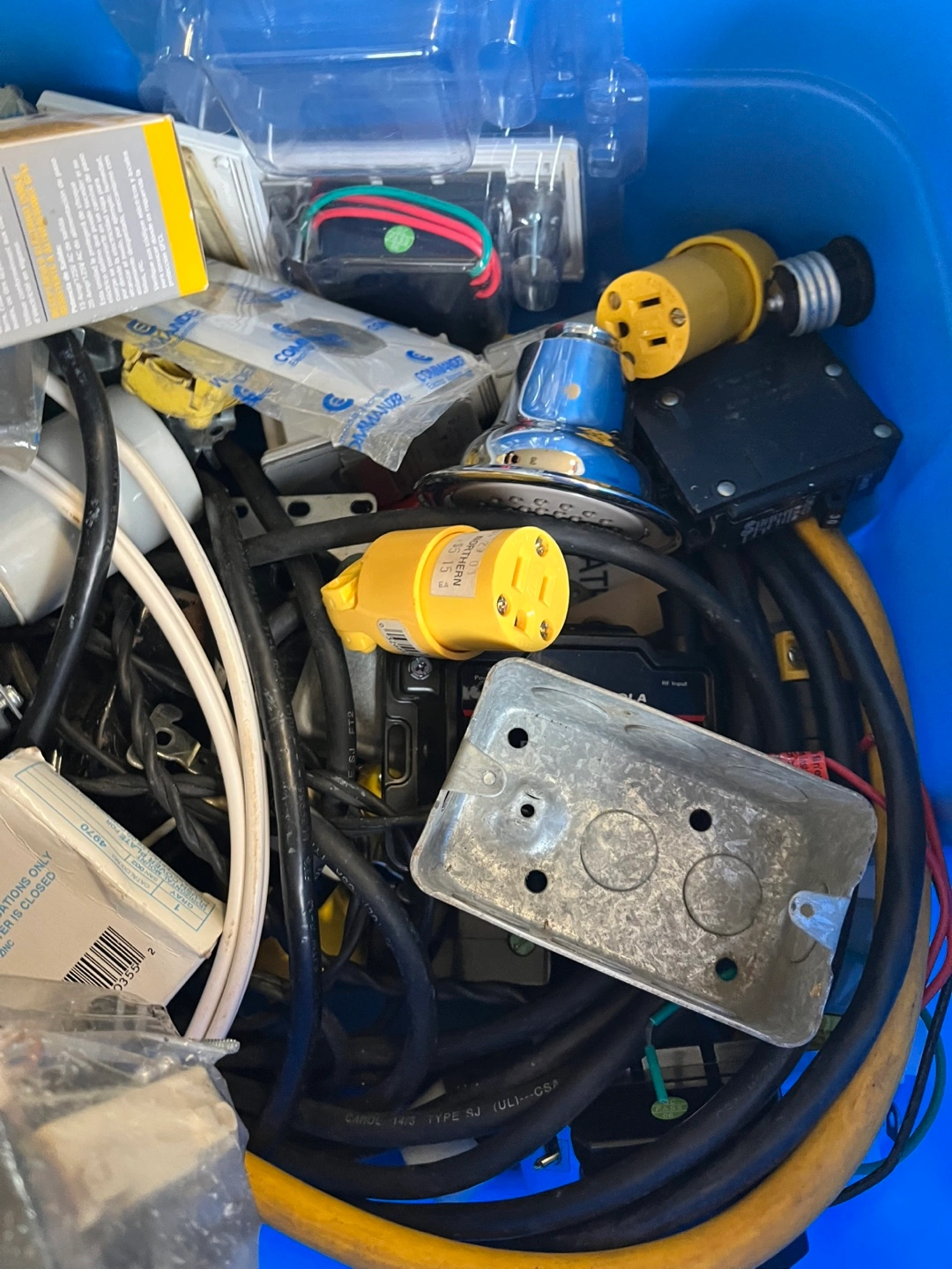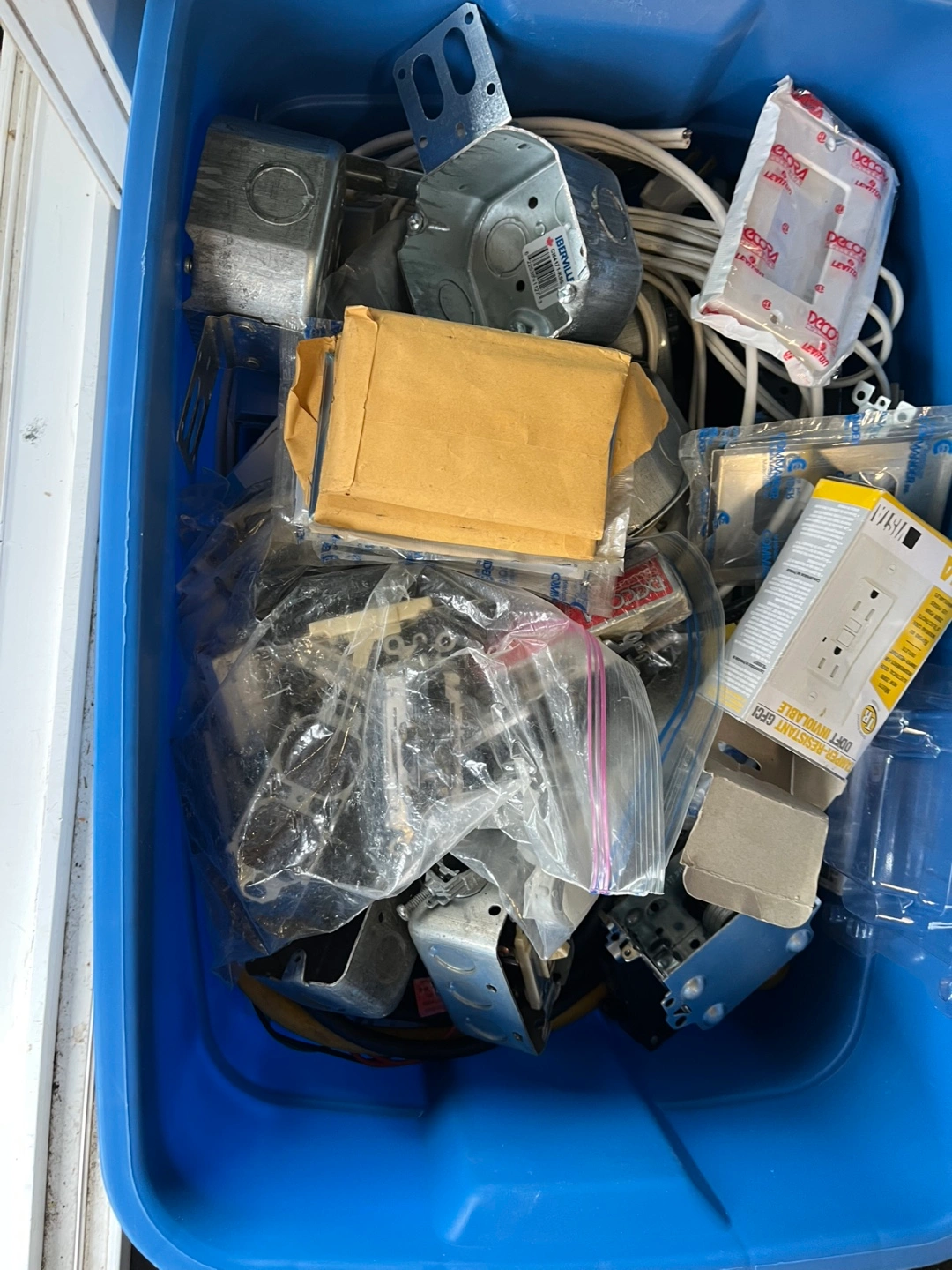 Large bin of miscellaneous electrical components. Includes various receptacles, switches, boxes, wiring, and other hardware. Great for electricians or DIY projects. Some items appear new, others used.