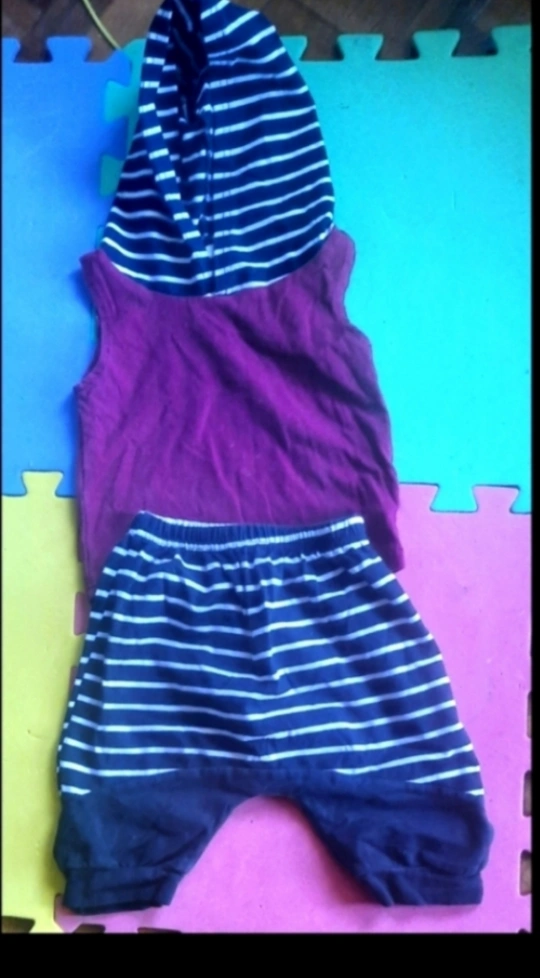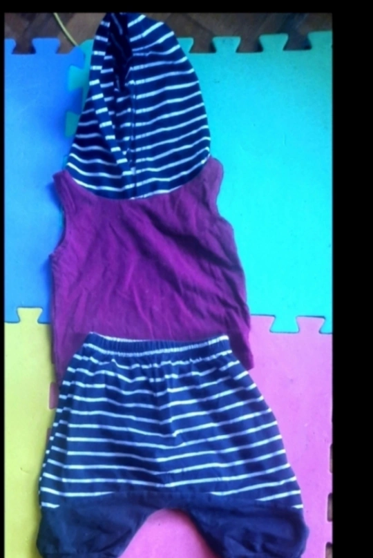 Adorable two-piece outfit for baby boys. Features a sleeveless maroon shirt and striped shorts. Hooded shirt, black and white stripes. Great for summer.