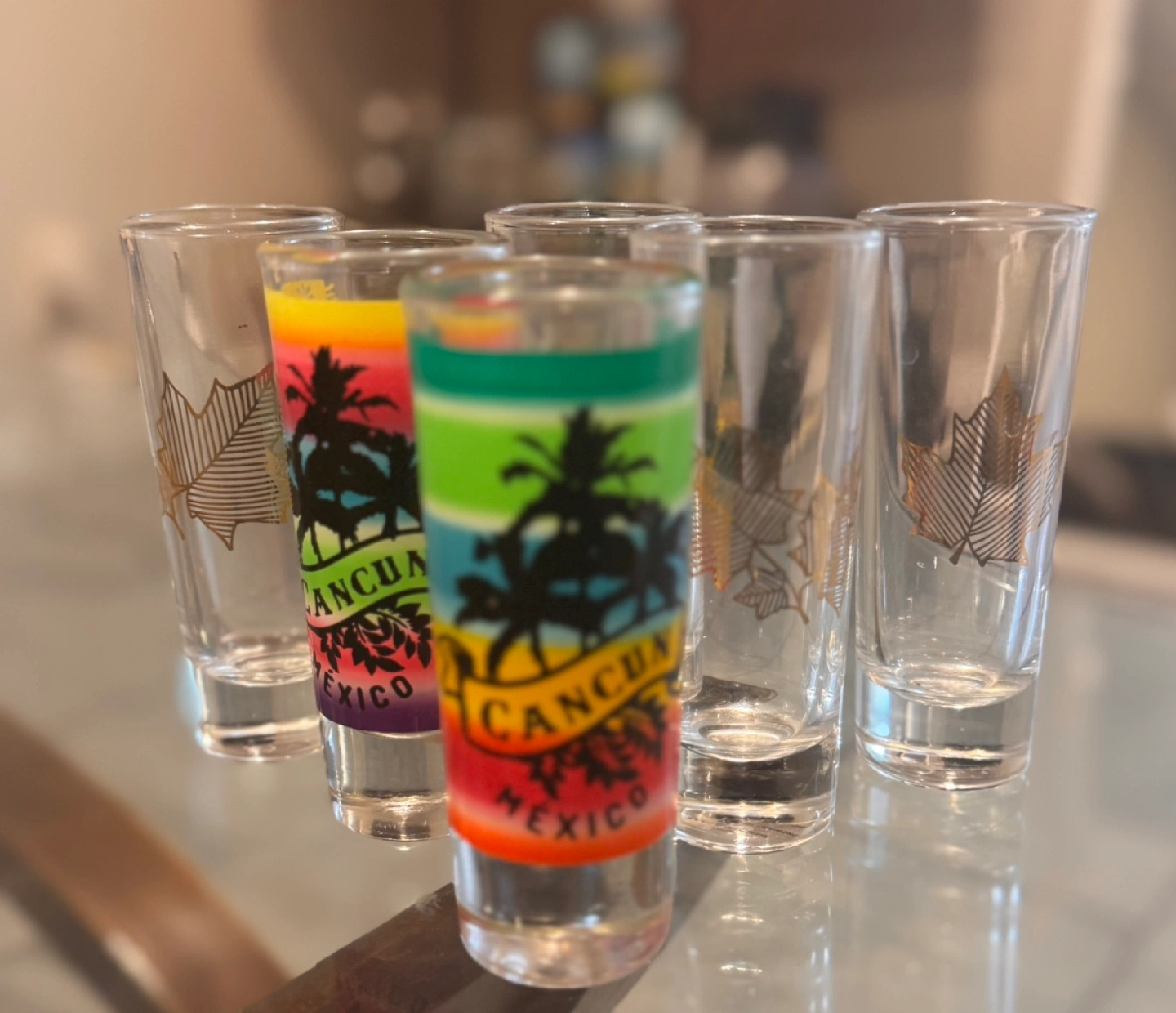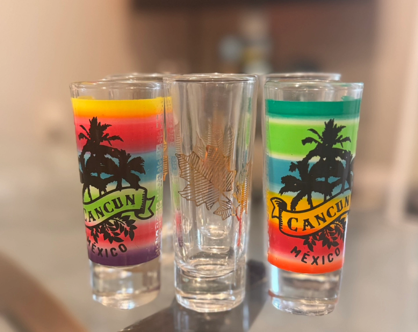 Six shot glasses (2shot). Two feature a Cancun, Mexico design. Four feature a gold maple leaf design. Perfect for parties or everyday use.