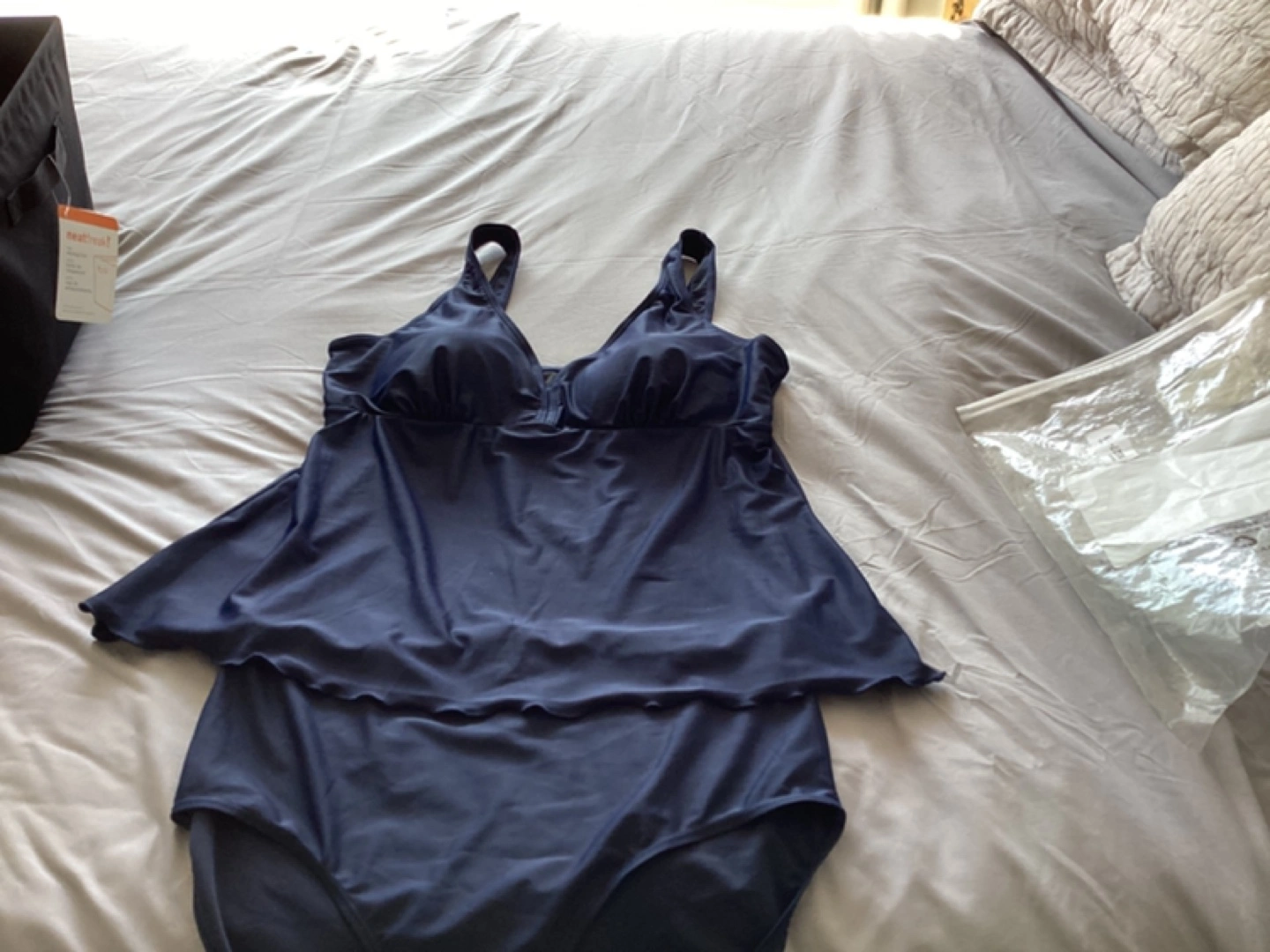 Navy blue women's two-piece swimsuit. Size 18W. Features a tankini top with a ruffled bottom and high-waisted bottoms. Looks new, never worn. Hand wash cold water. Do not bleach.
