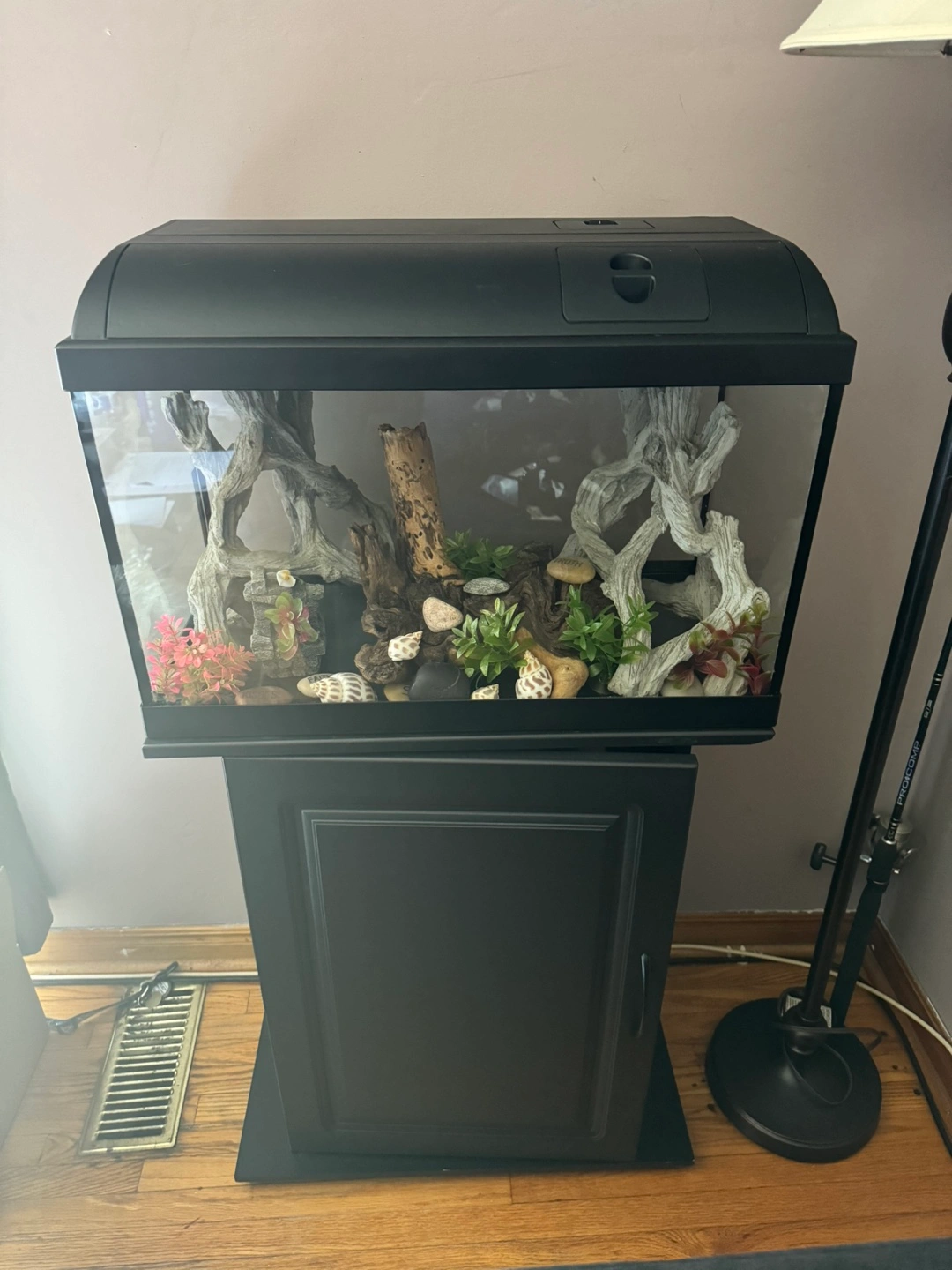 Twenty-gallon aquarium kit. Black stand, plant light bulb, artificial plants and decor included.