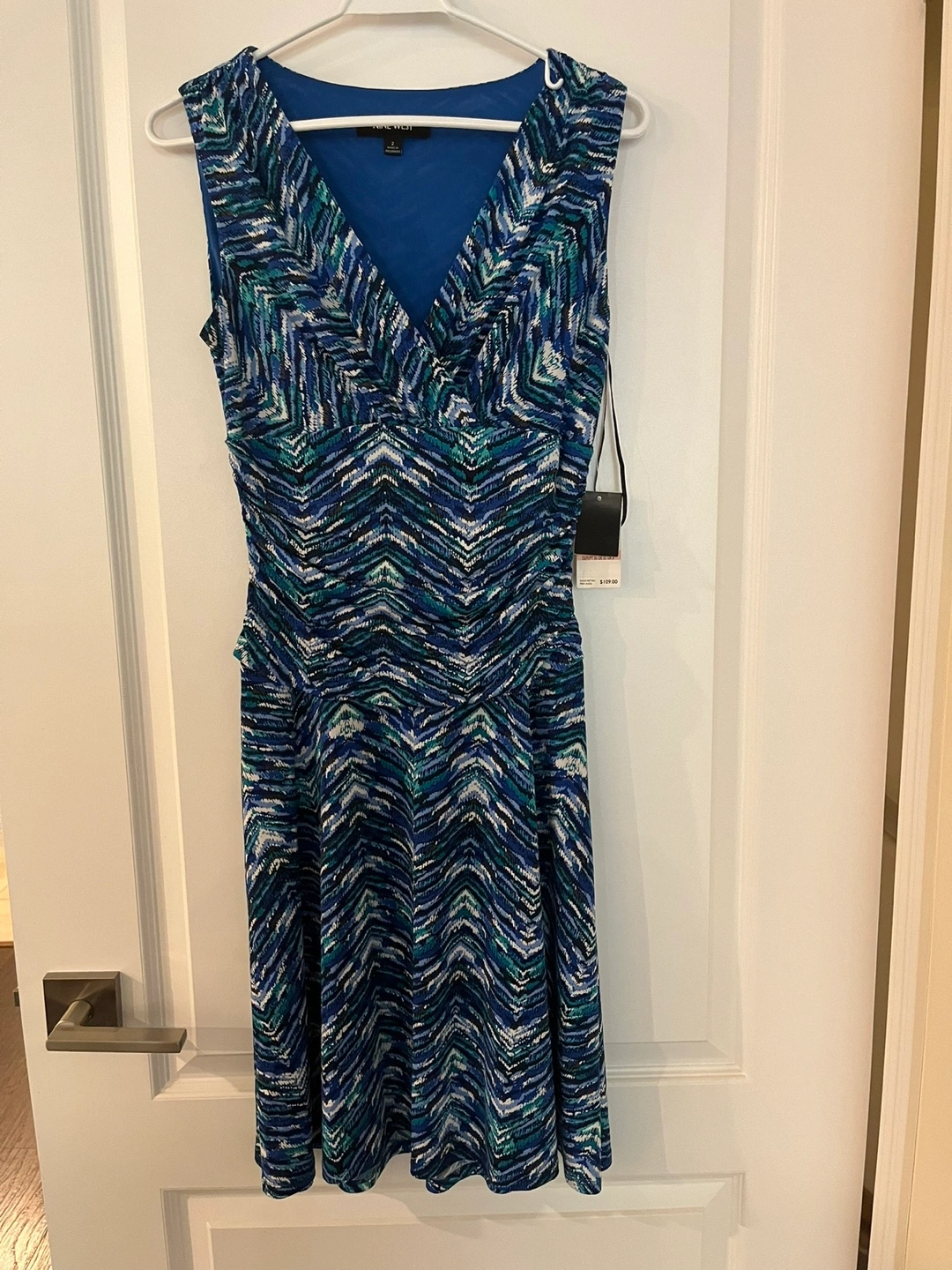 Beautiful Nine West dress. Size 2. Sleeveless, V-neck, abstract print in shades of blue and green. new with tags.