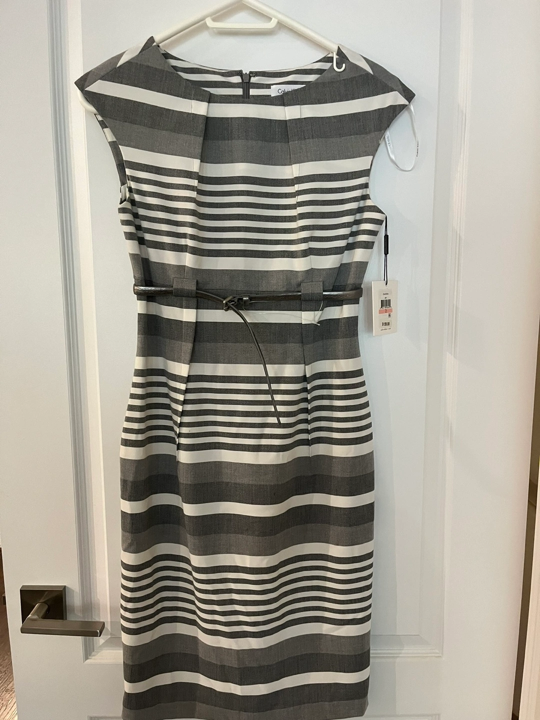 Calvin Klein sheath dress. Grey and white stripes. Cap sleeves. Belted waist. Size 2. New with tags.