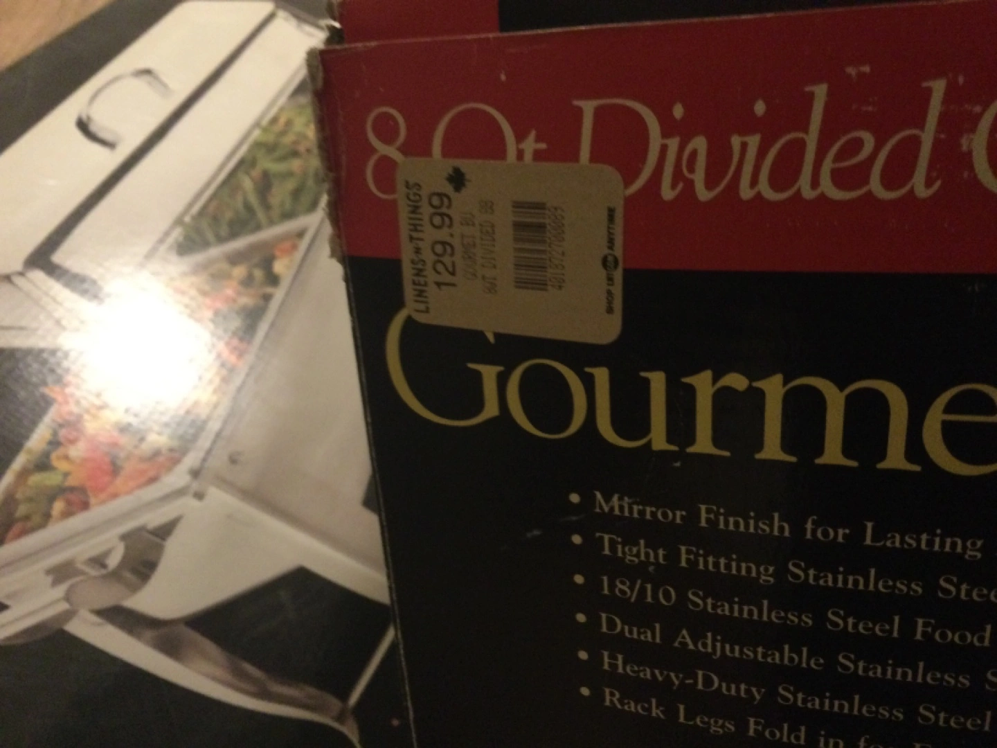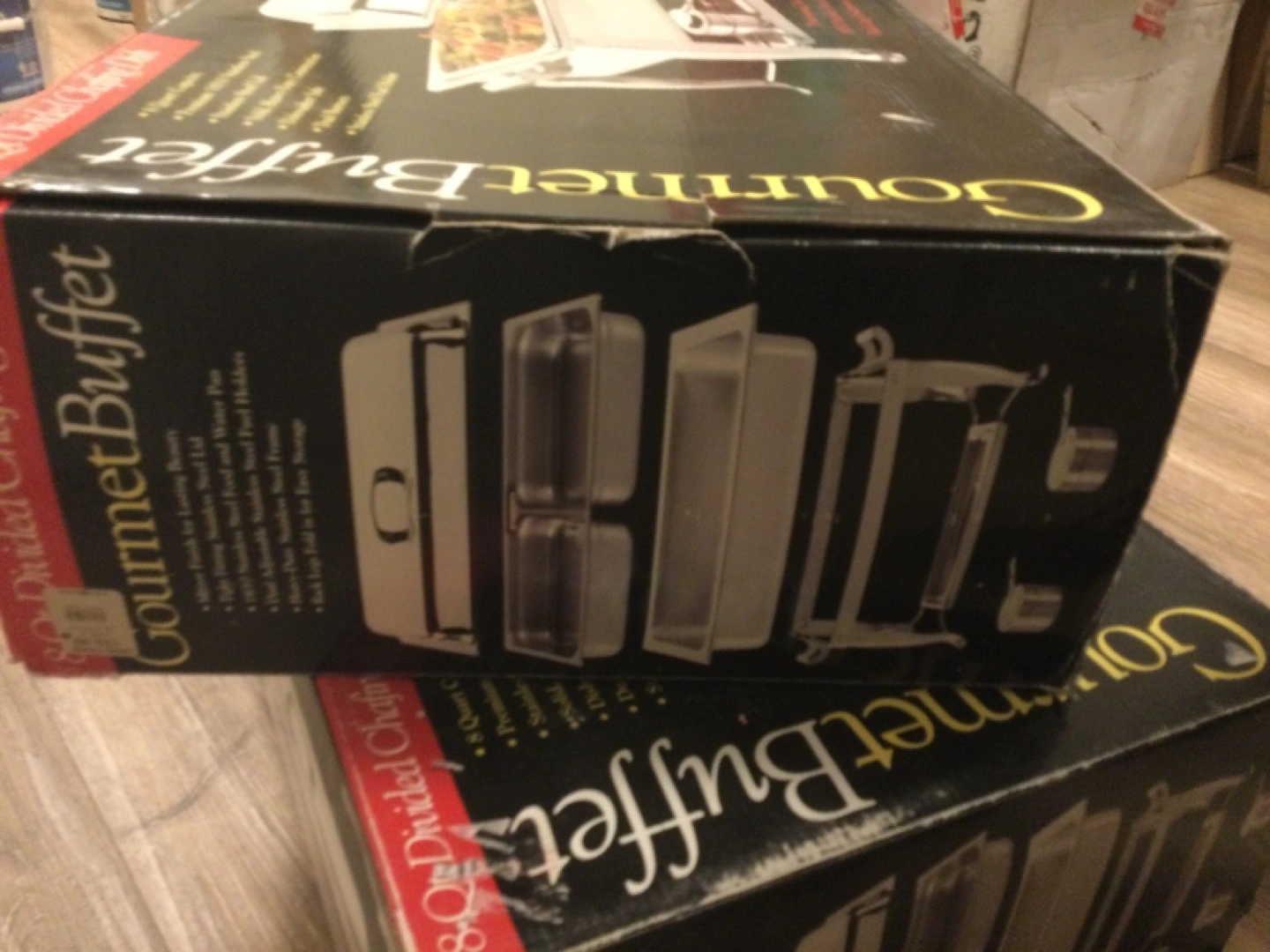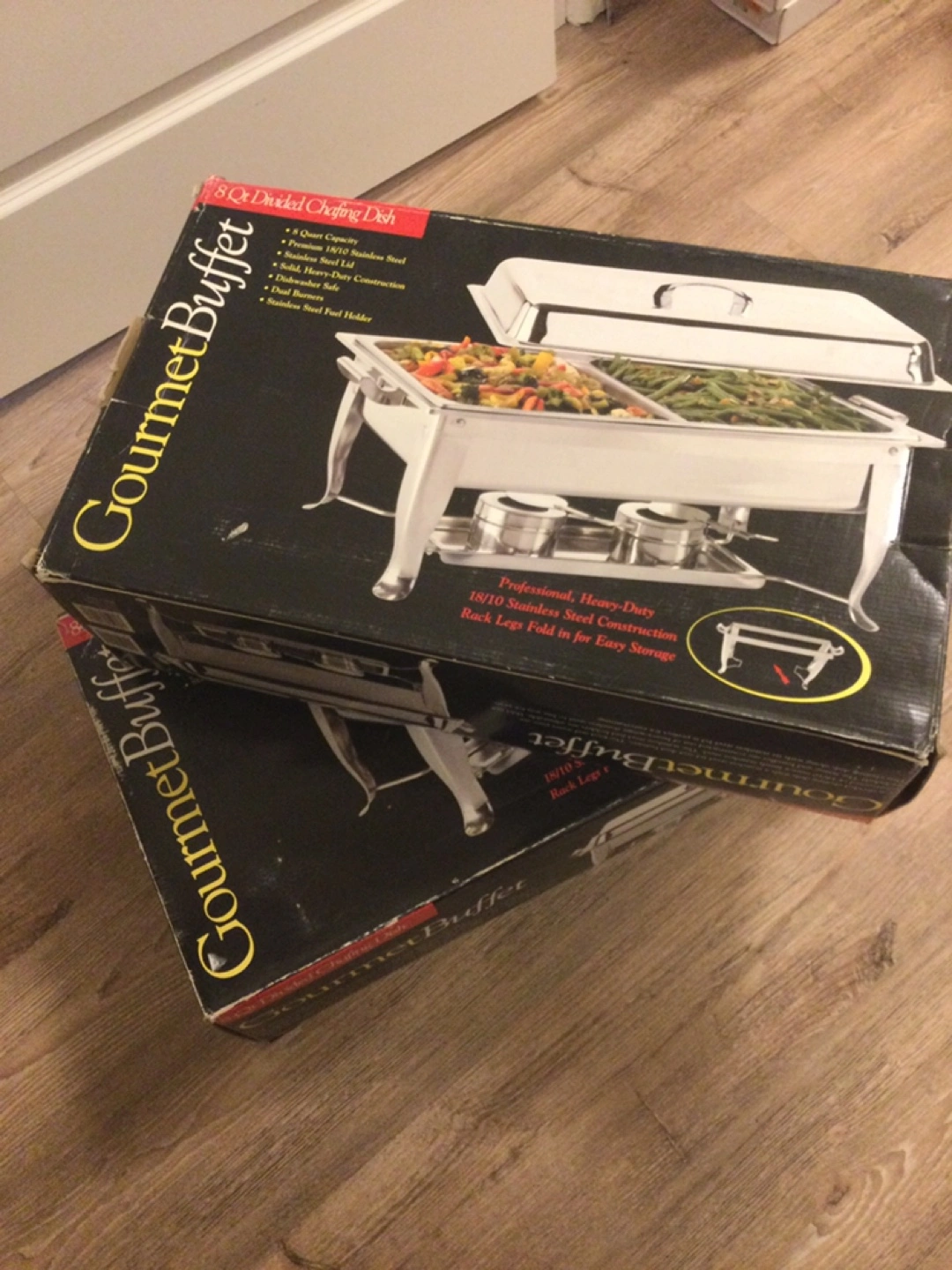 2 sets of buffet Stainless steel warming servers. Eight quart capacity. Divided into two sections. Mirror finish. Heavy-duty construction. Foldable rack legs for easy storage. Great for parties Only $75 each…regular price was $130