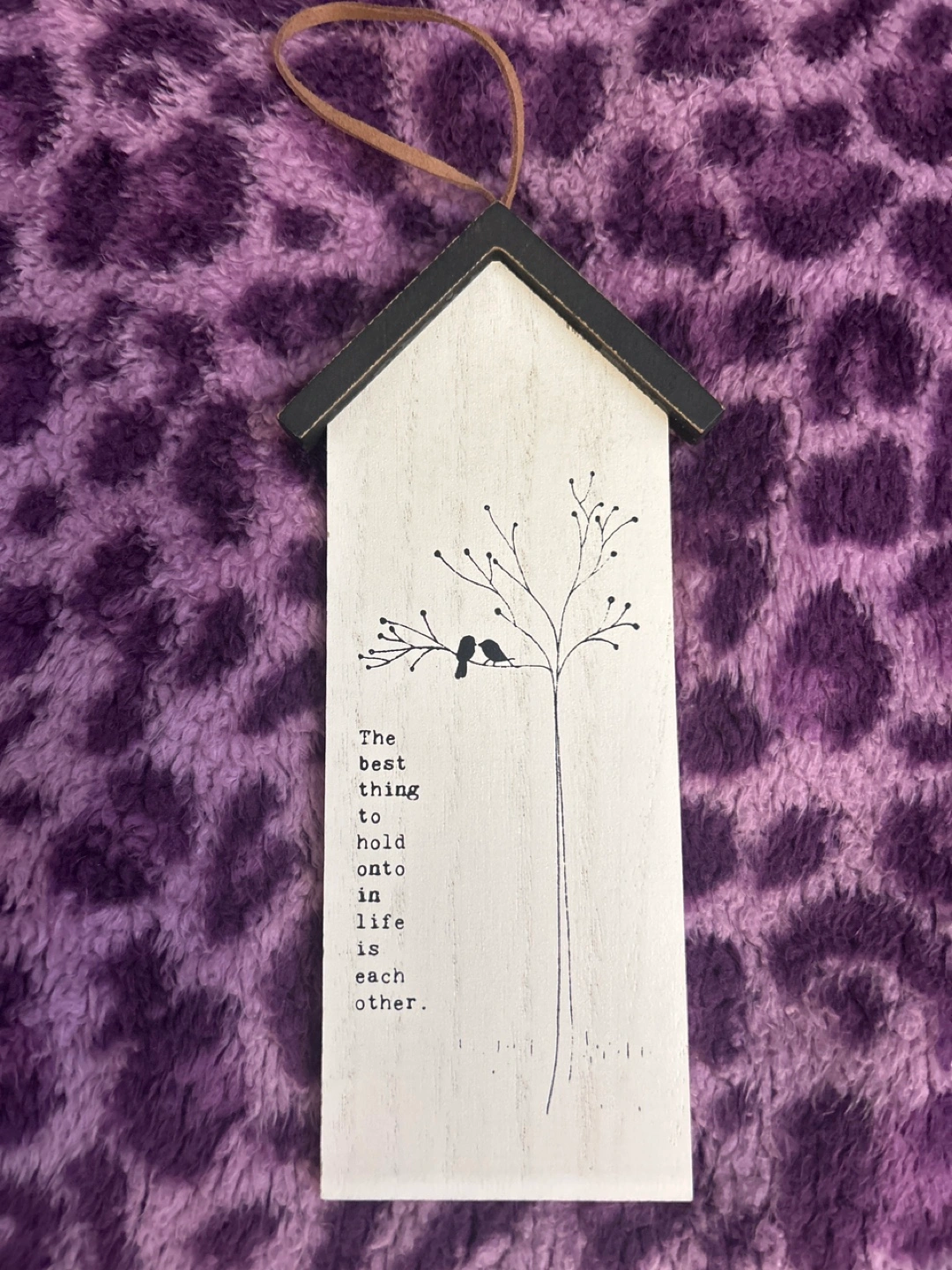 Small wooden hanging ornament. Features a quote about love and a minimalist tree design. Brown leather-like hanger.