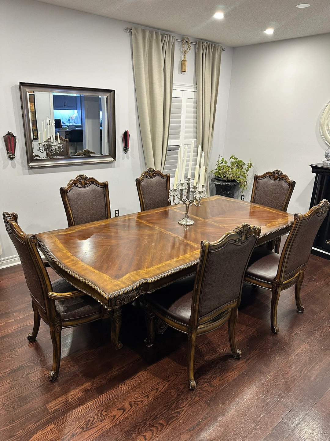 Beautiful dining table and six chairs. Dark brown wood finish. Intricate carvings. Brown leatherette upholstery on chairs. Excellent for formal dining.