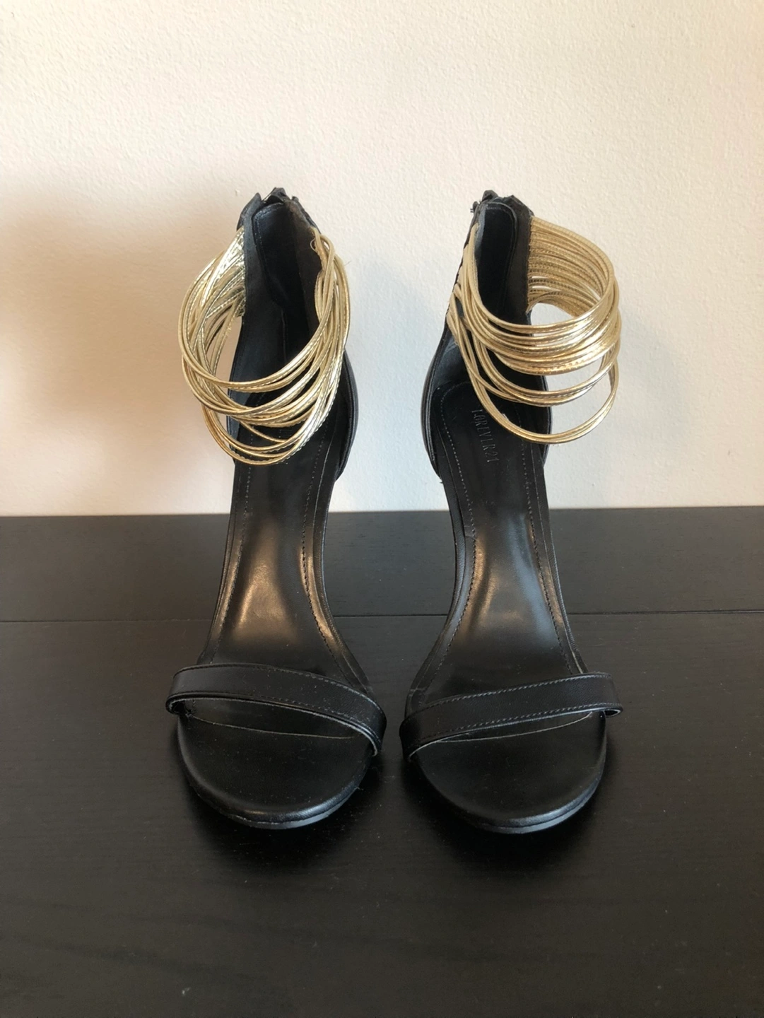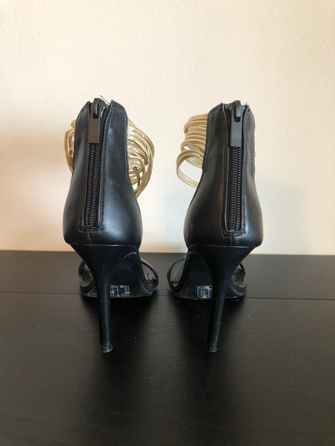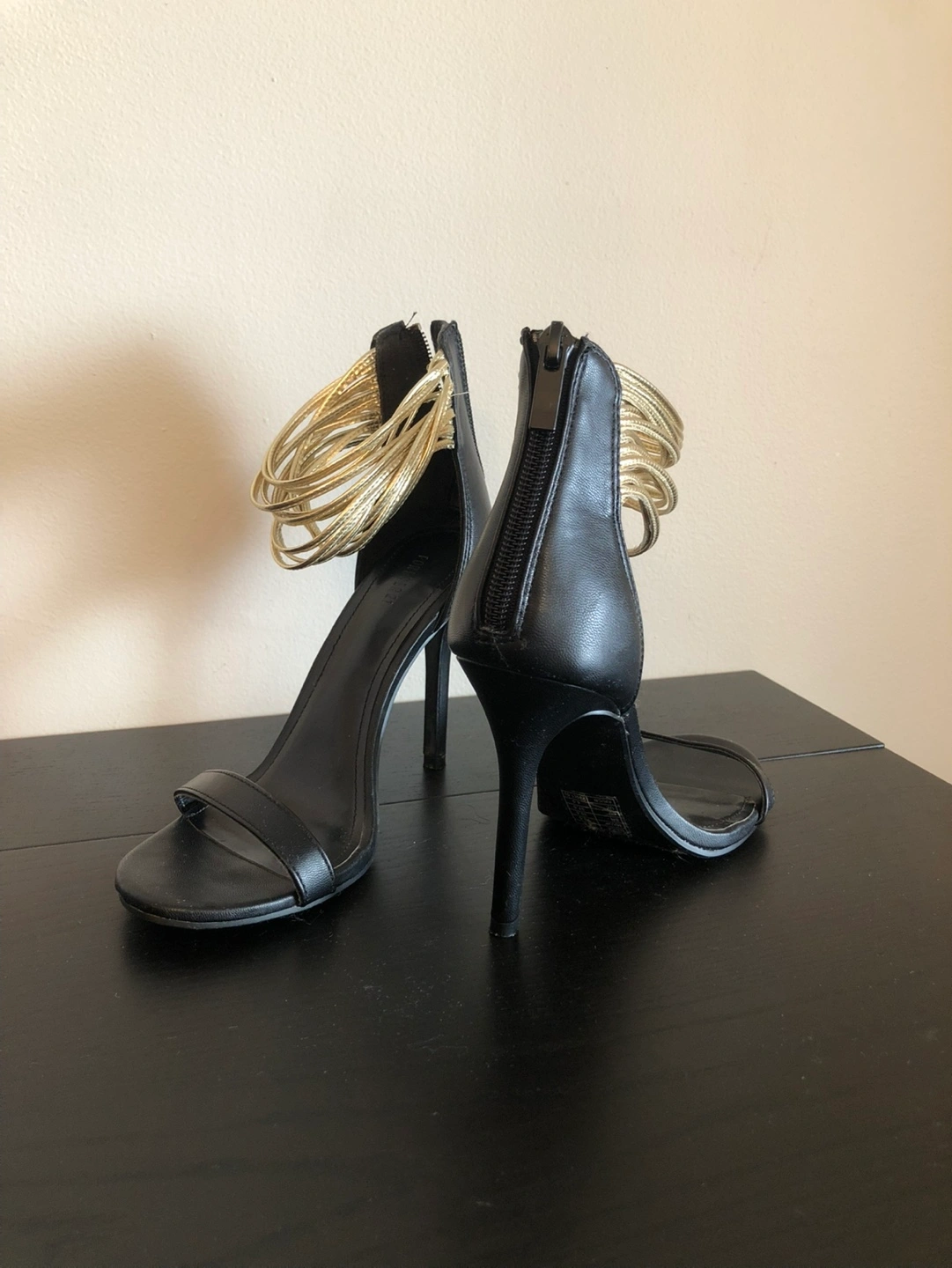 Stylish black high heels. Gold layered ankle strap. Back zipper closure. Elegant and comfortable. Used two times only Pick up at Rosedale subway station. Cash only!