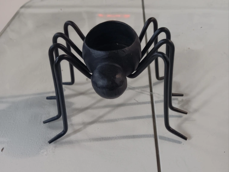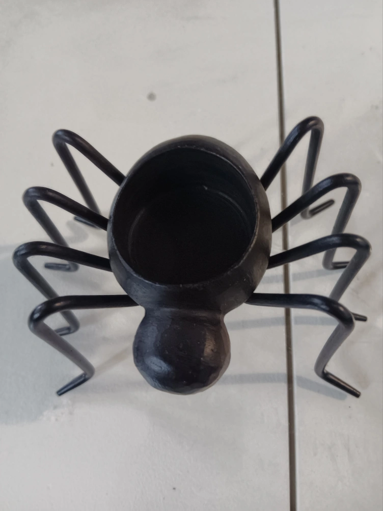 Cute spider-shaped candle holder. Metal construction. Holds a small votive candle.