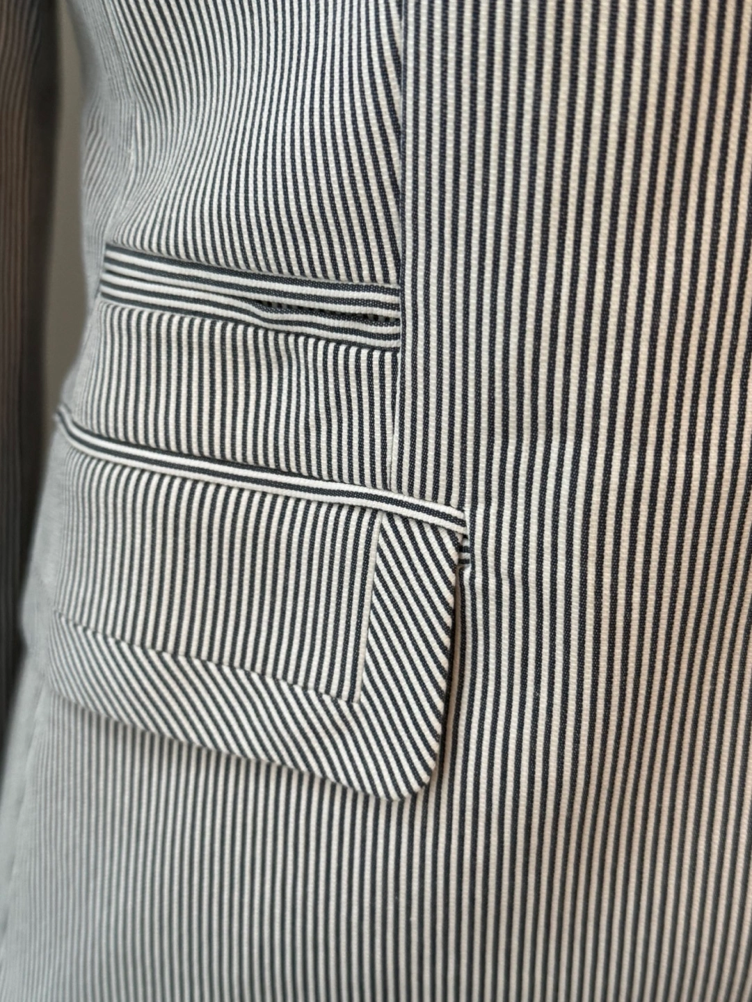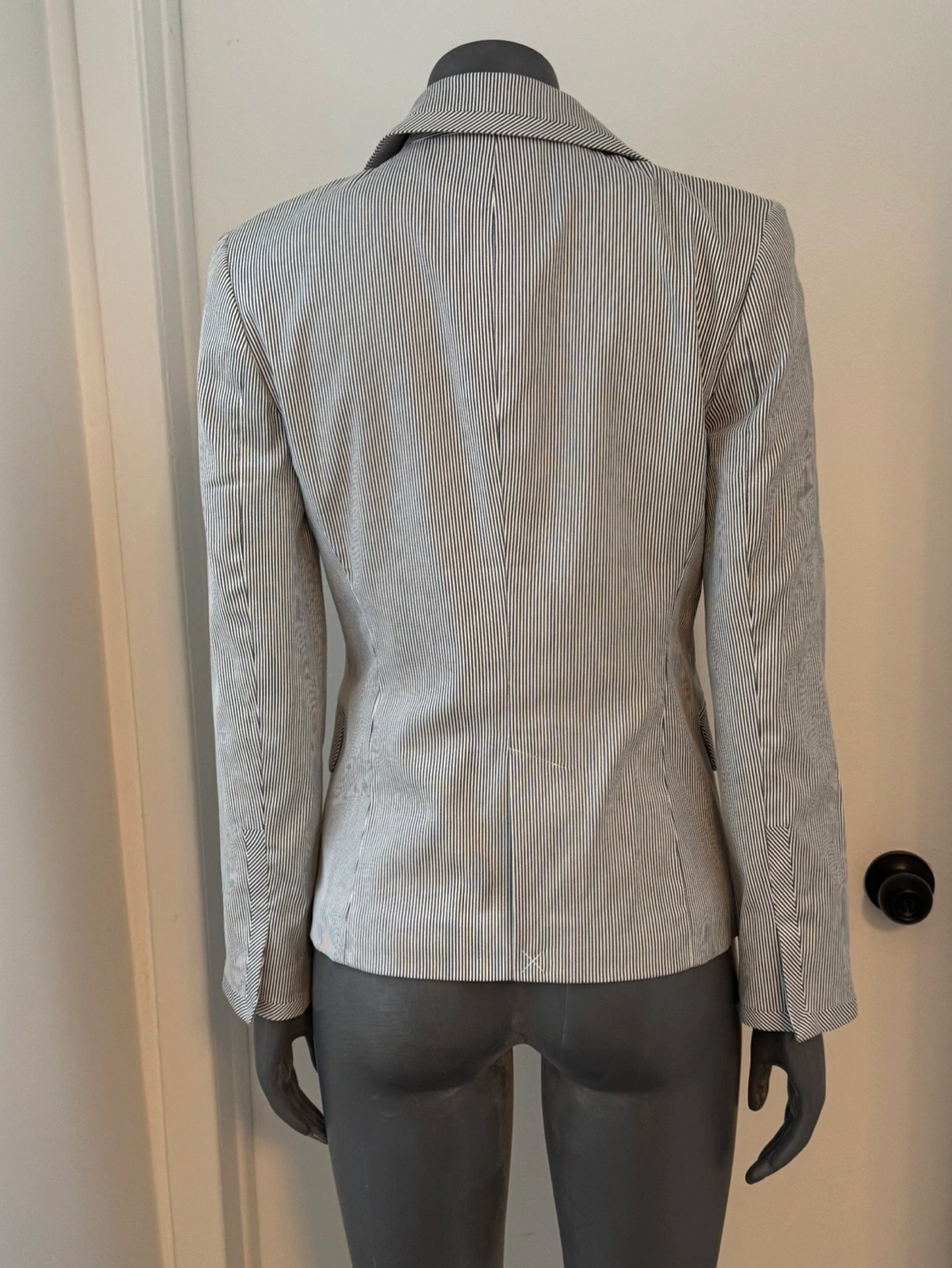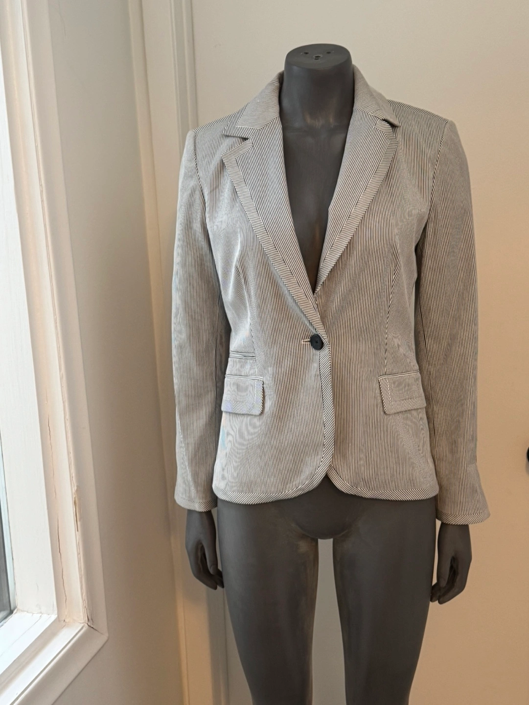 Neat, well-tailored women's blazer. Features a single button closure, notched lapel, and welt pockets. Classic striped pattern, suitable for work or casual wear. NWOT