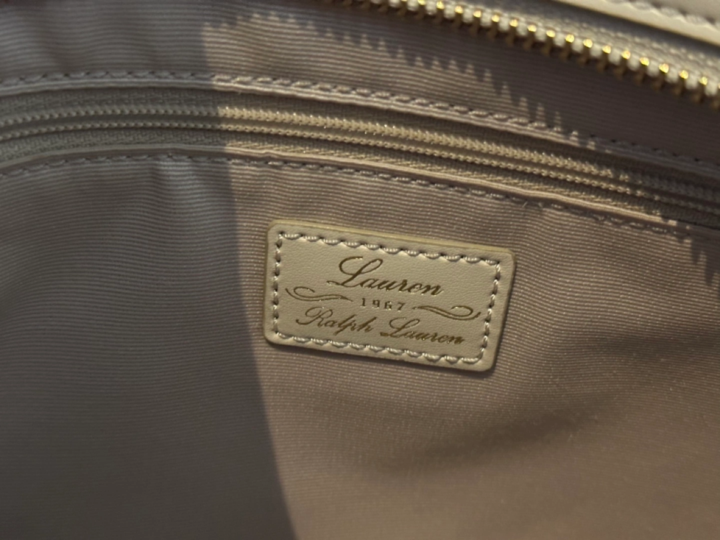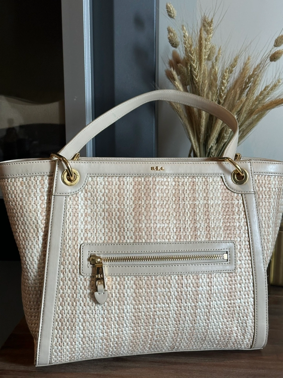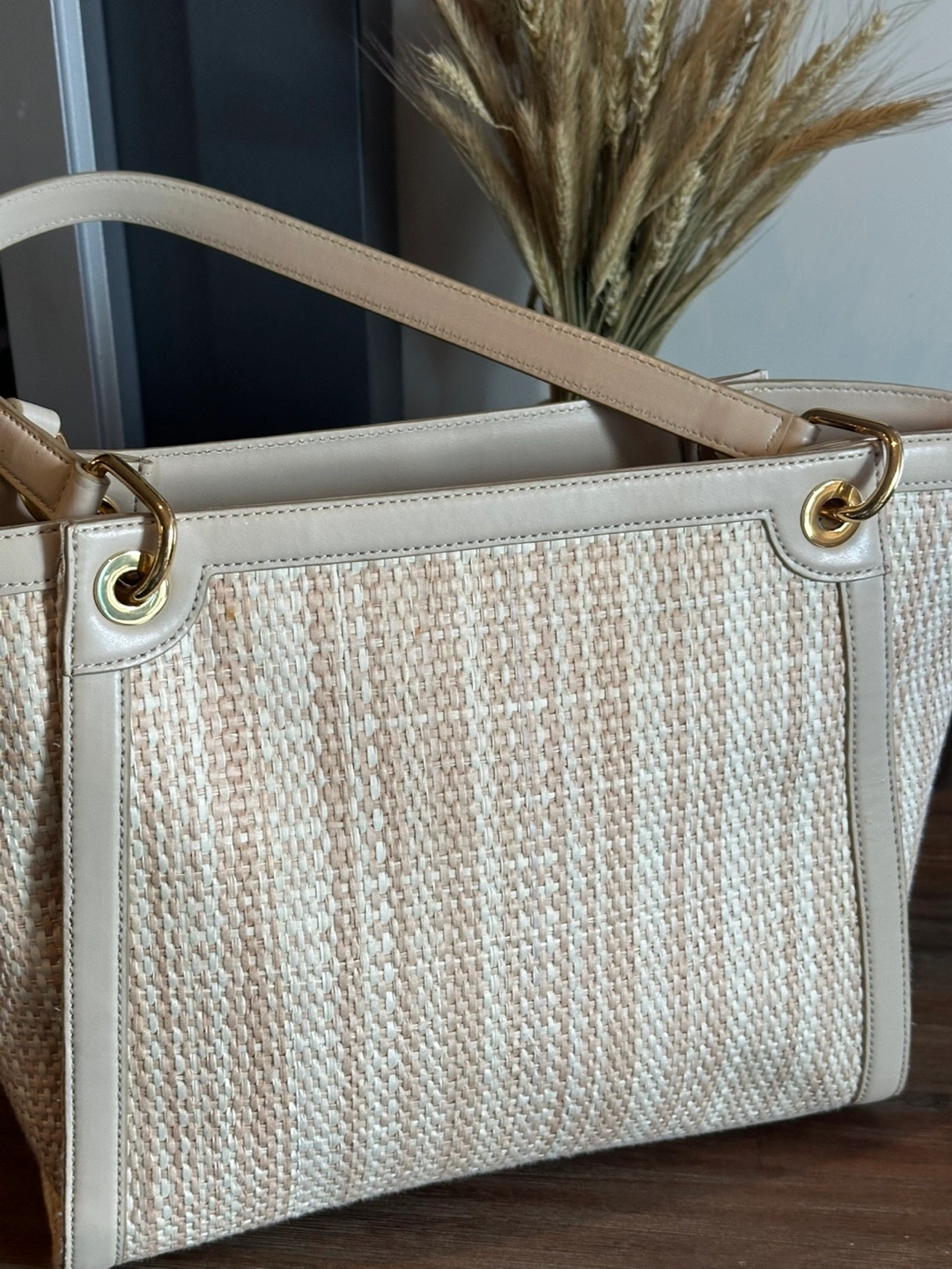 Cream coloured woven tote bag. Features leather trim and gold-toned hardware. Interior zip pocket. Top handles. Great condition! One tiny spot on inside at the bottom but barely noticeable. Otherwise basically brand new!