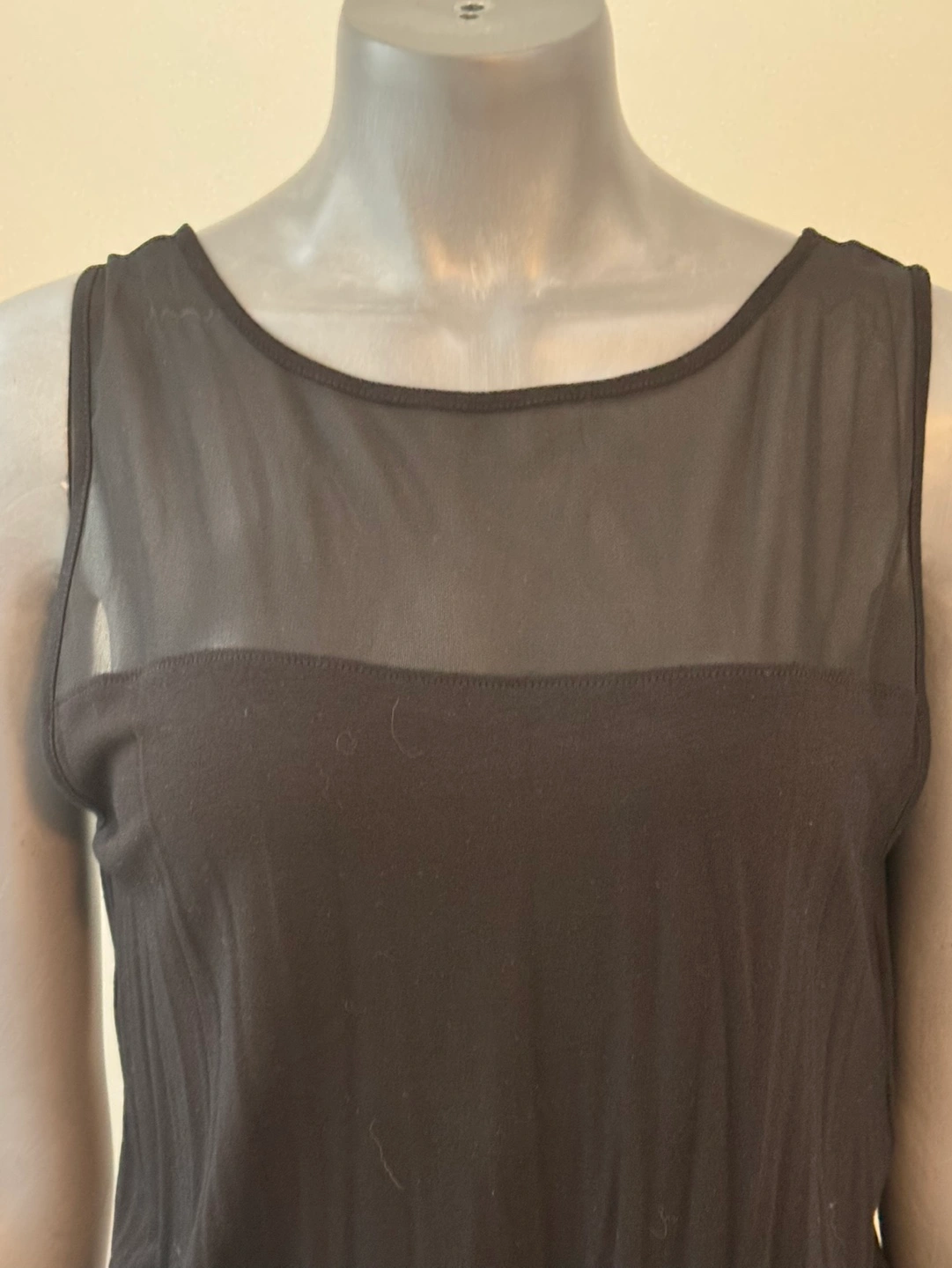 Elegant black jumpsuit. Features wide legs and sleeveless design. Sheer panel at neckline. Drawstring waist. NWOT tags and never worn