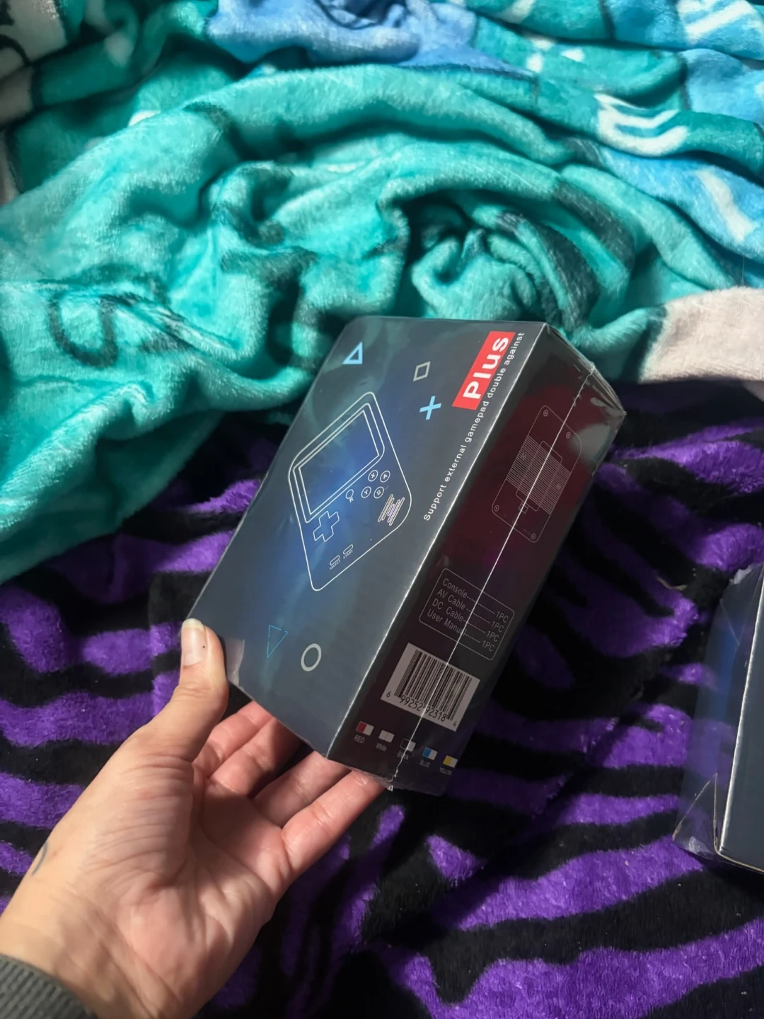 Portable retro game console with a built-in screen. Supports external gamepad and double against for multiplayer fun. Includes console, AV cable, DC cable, and user manual.