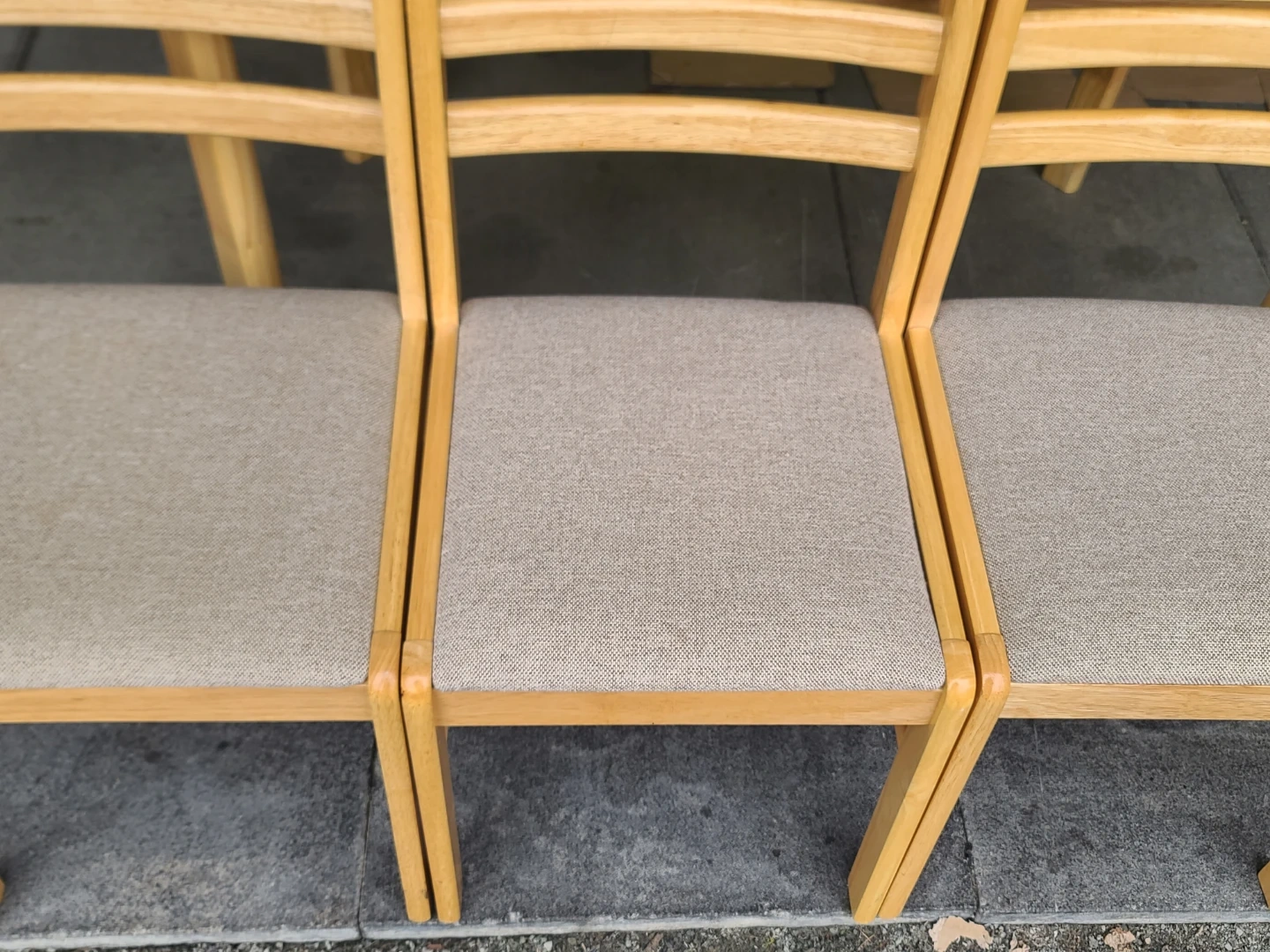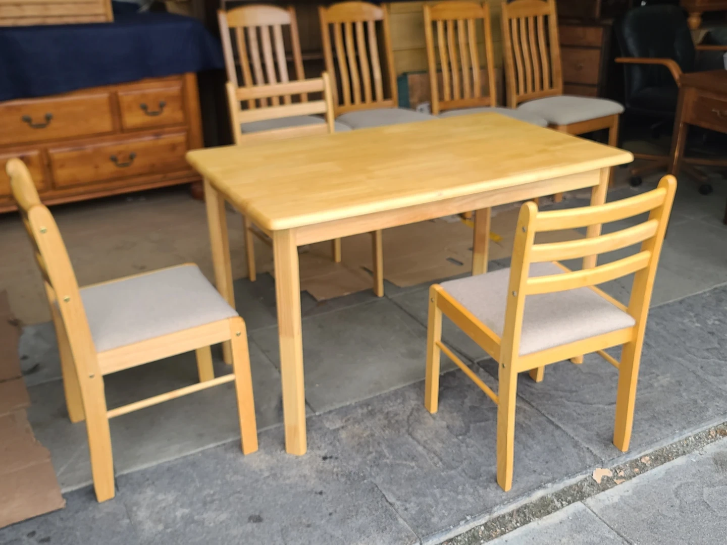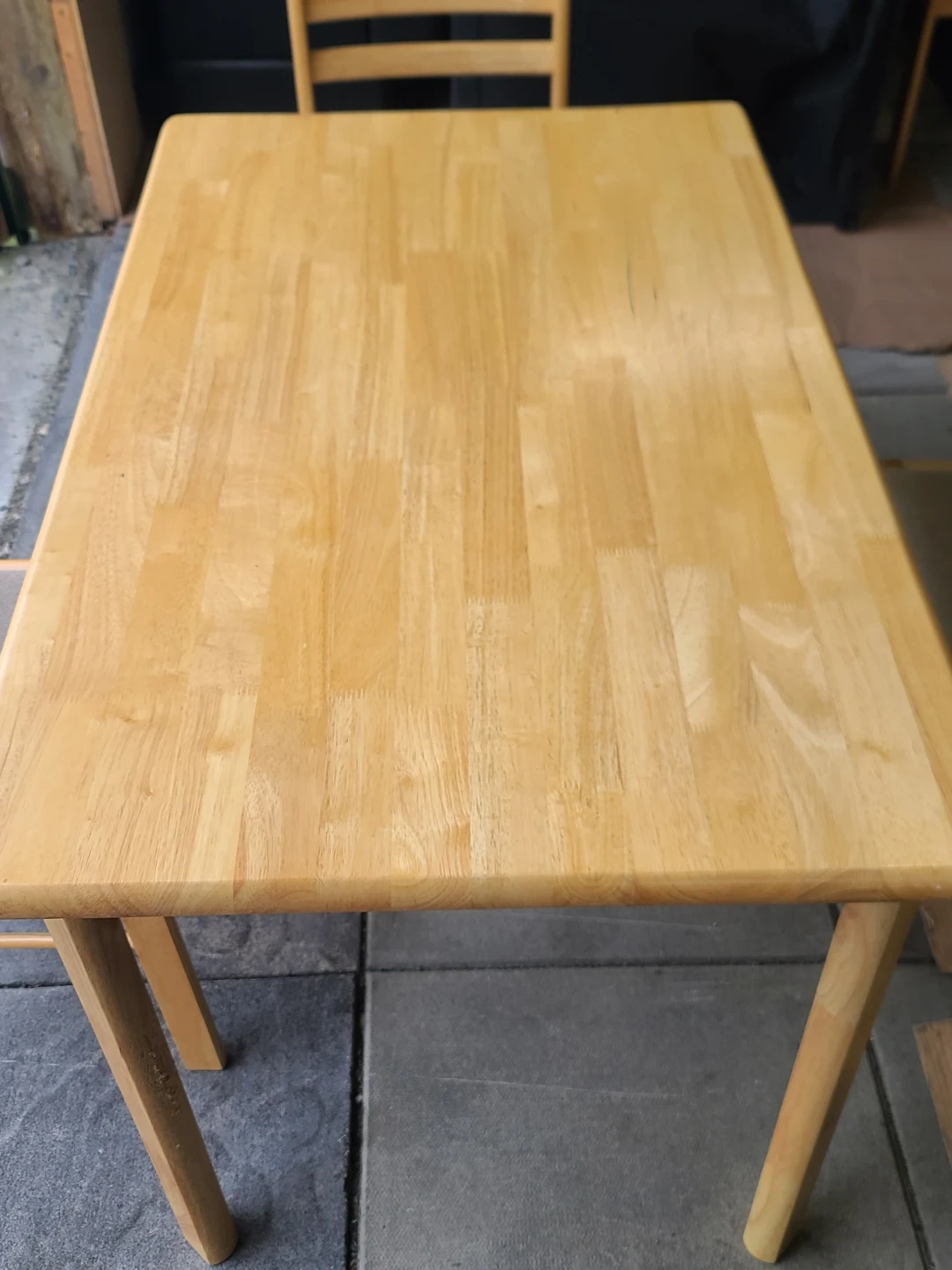 Light wood dining set, comes with 3 chairs. Upholstered seats on chairs. Great for a small space or kitchen nook. The chairs have beige fabric seats. Measurements: W 47" X D 29" X H 29". Delivery can be arranged. Viewing and pickup by appointment.