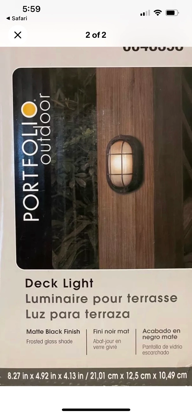 New in open box. Matte black finish. Frosted glass shade. Oval shape. Includes mounting hardware. Outdoor rated.