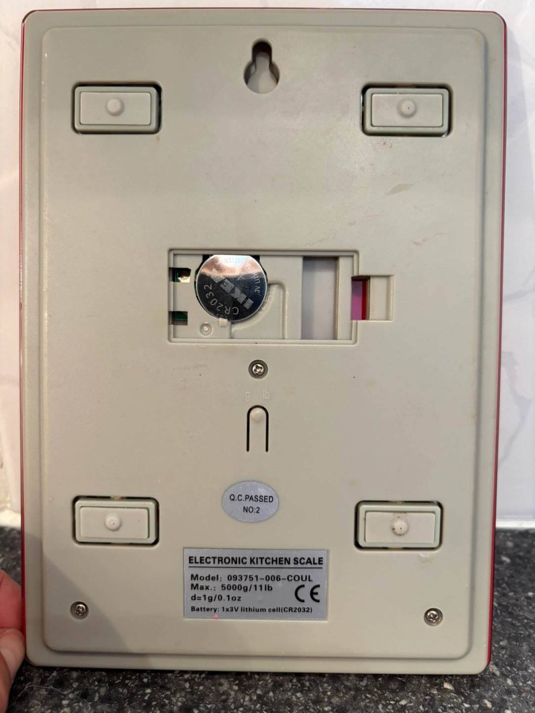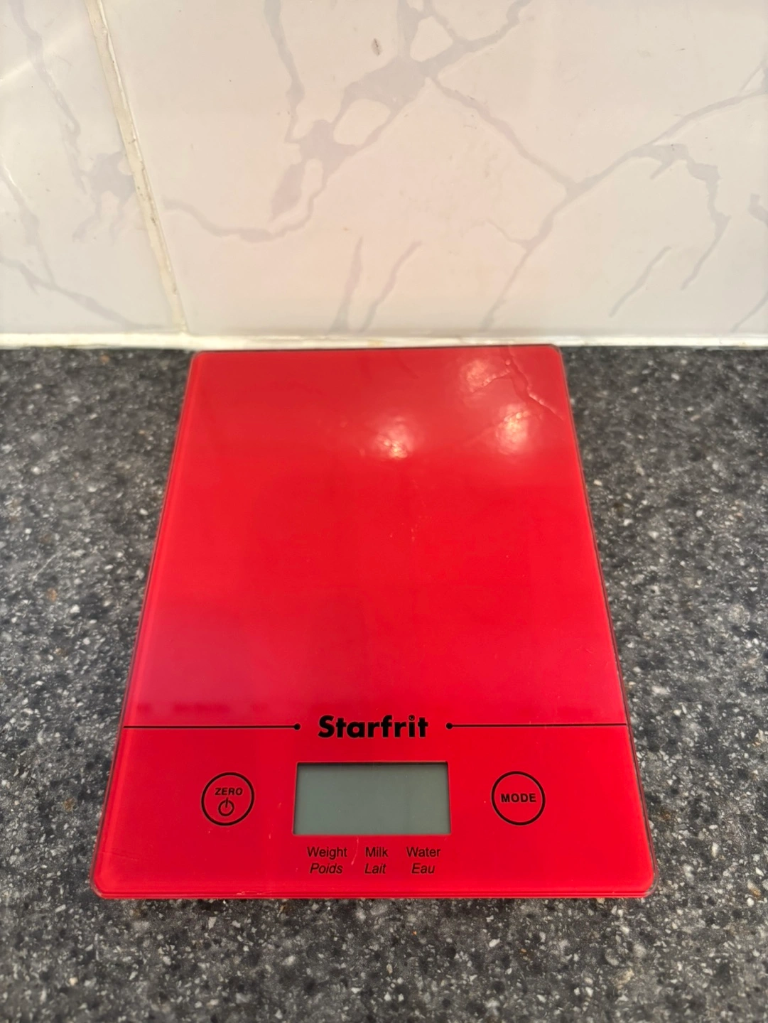 Red electronic kitchen scale. Measures in grams, kilograms, ounces, and pounds. Features tare function and multiple measurement modes. Compact and lightweight design. Battery operated.