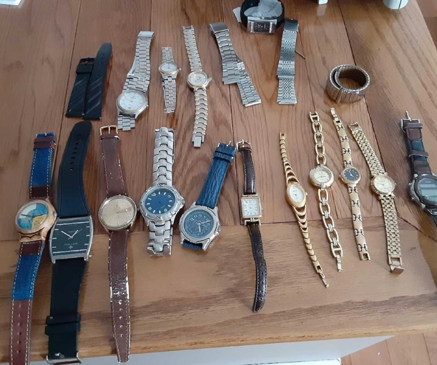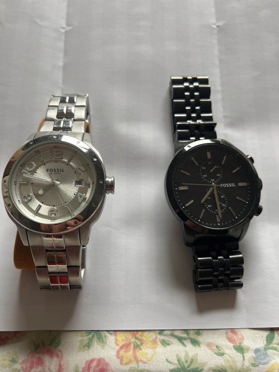 Pair of Fossil watches. One silver tone, one black. Both have metal bands.