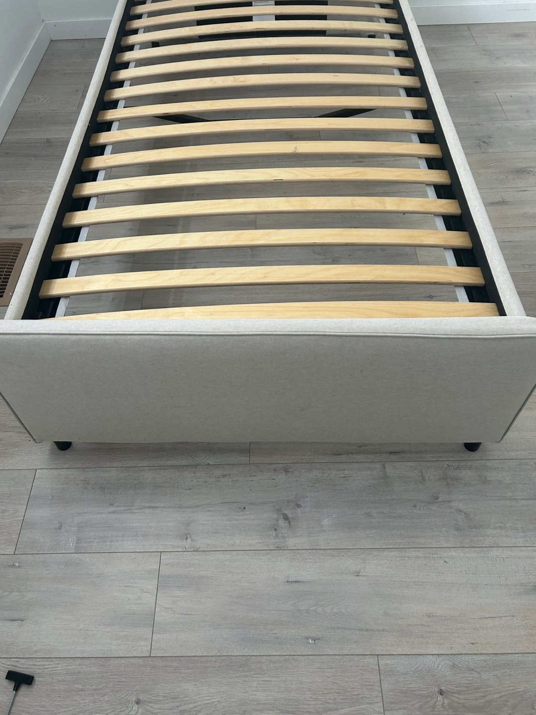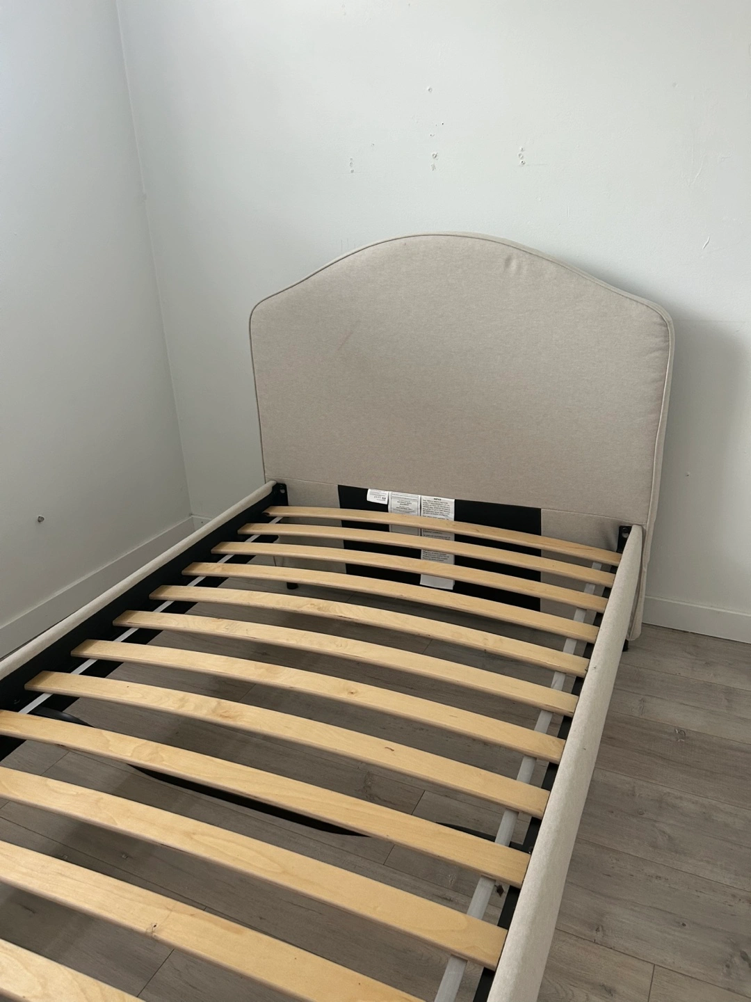 Single bed frame, off-white fabric headboard and frame. Includes wooden slats. Almost new condition. Easy assembly.