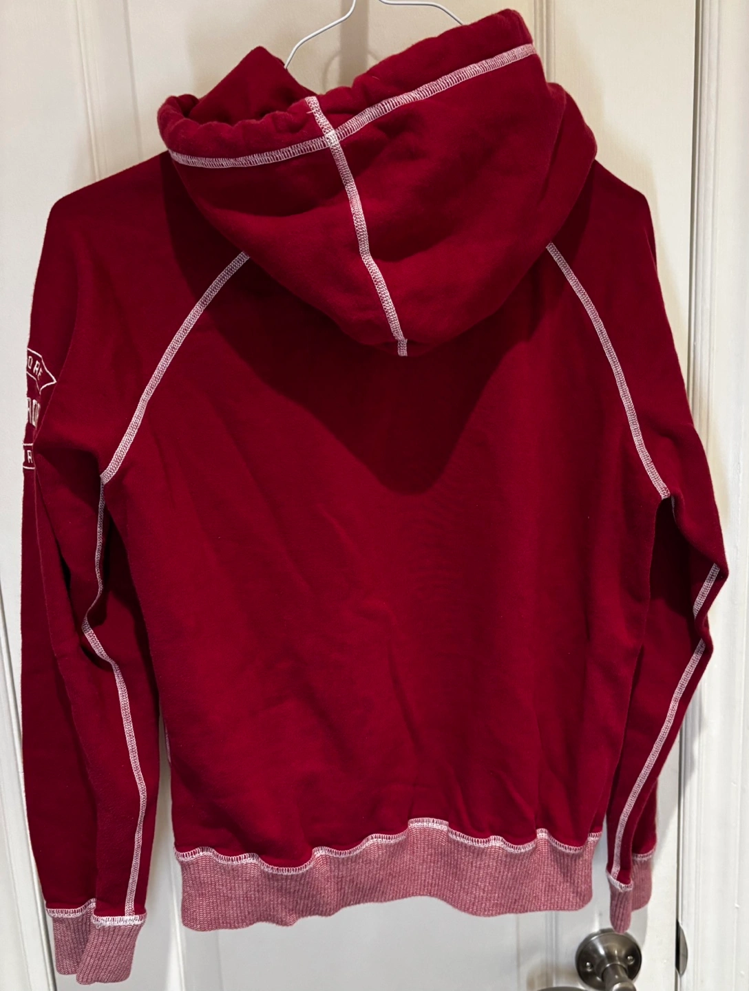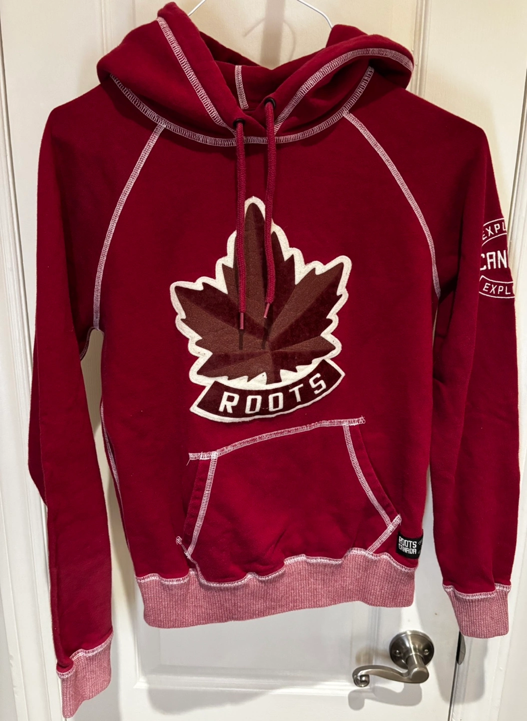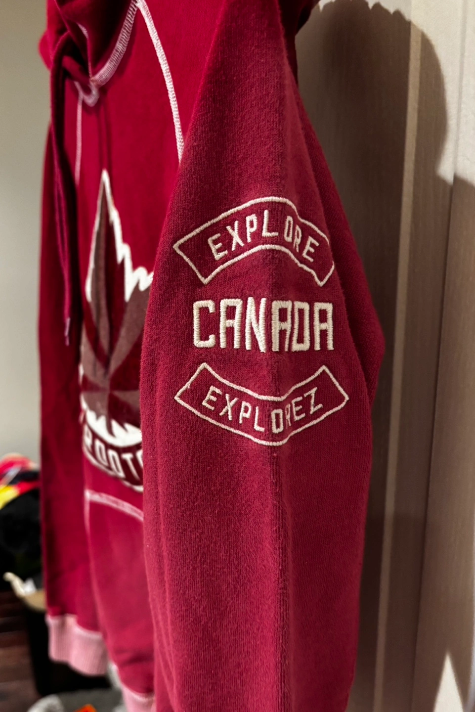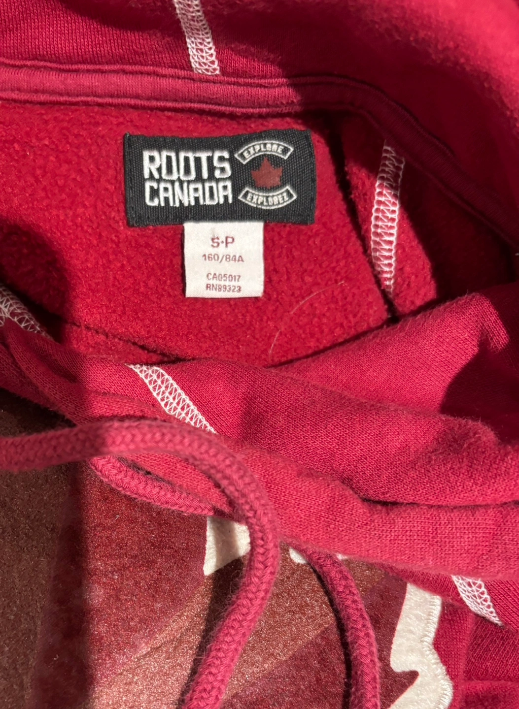Red Roots Canada hoodie. Features a large maple leaf design on the front and Explore Canada patches on the sleeves. Size small. Drawstring hood and kangaroo pocket.