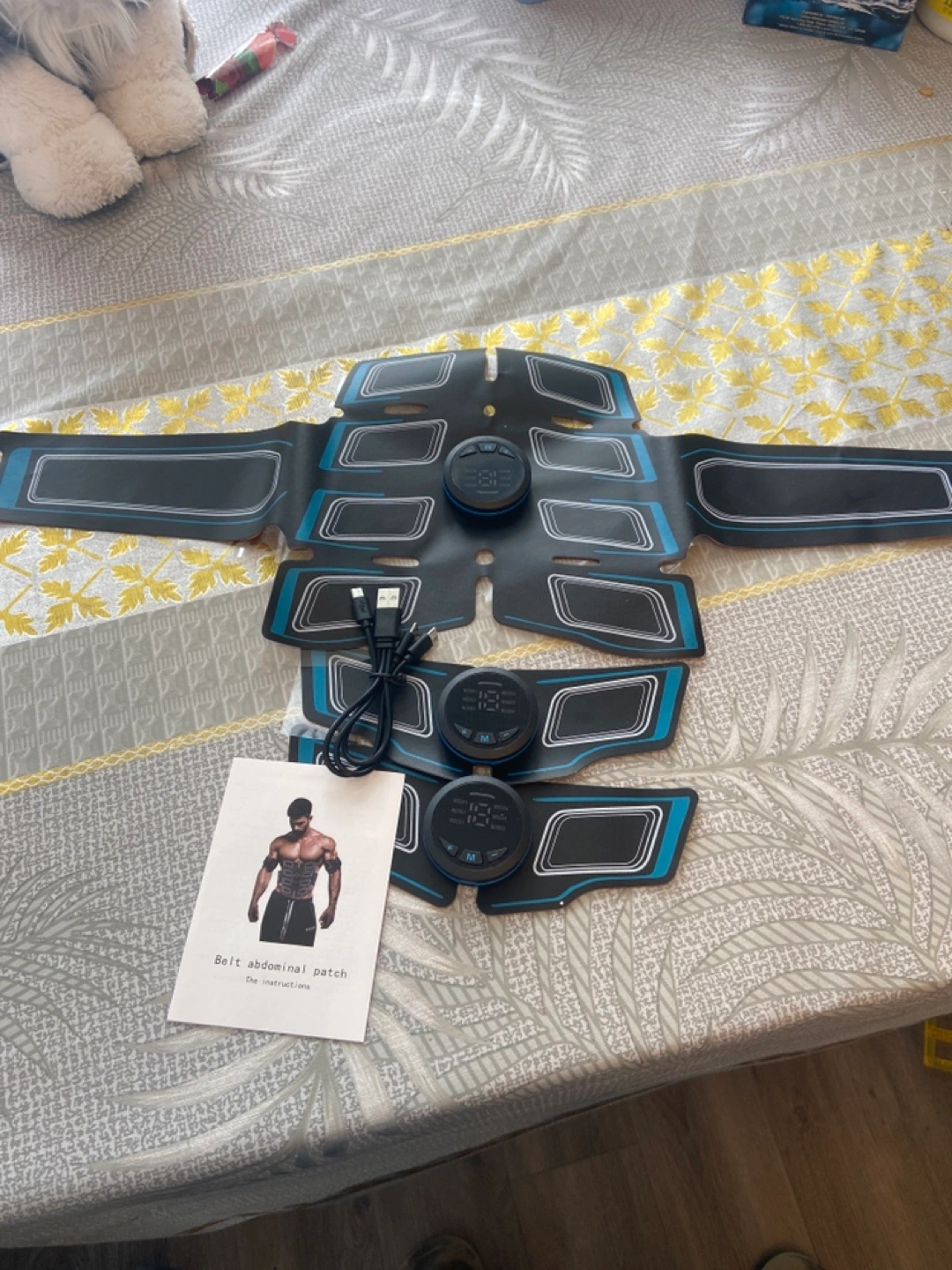 Wireless abdominal muscle stimulator. Includes belt, control units, and instructions. Great for core workouts.