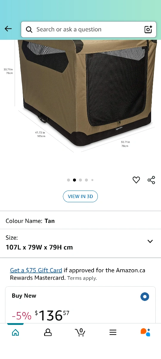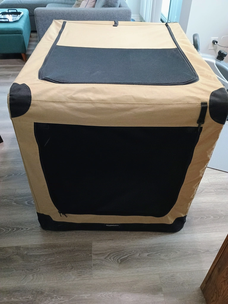 572Large soft-sided pet crate. Collapsible design. Minor wear - piece of tape covering a cut to the side. Measures 107L x 79W x 79H cm.
