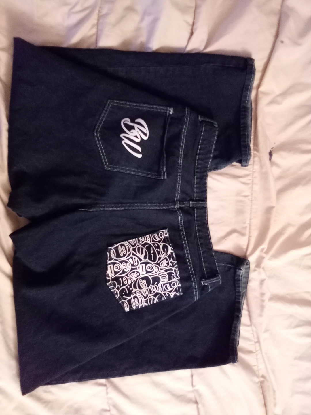 Dark wash denim jeans with white stitching detail. Wide leg fit. BW logo embroidered on back pocket.