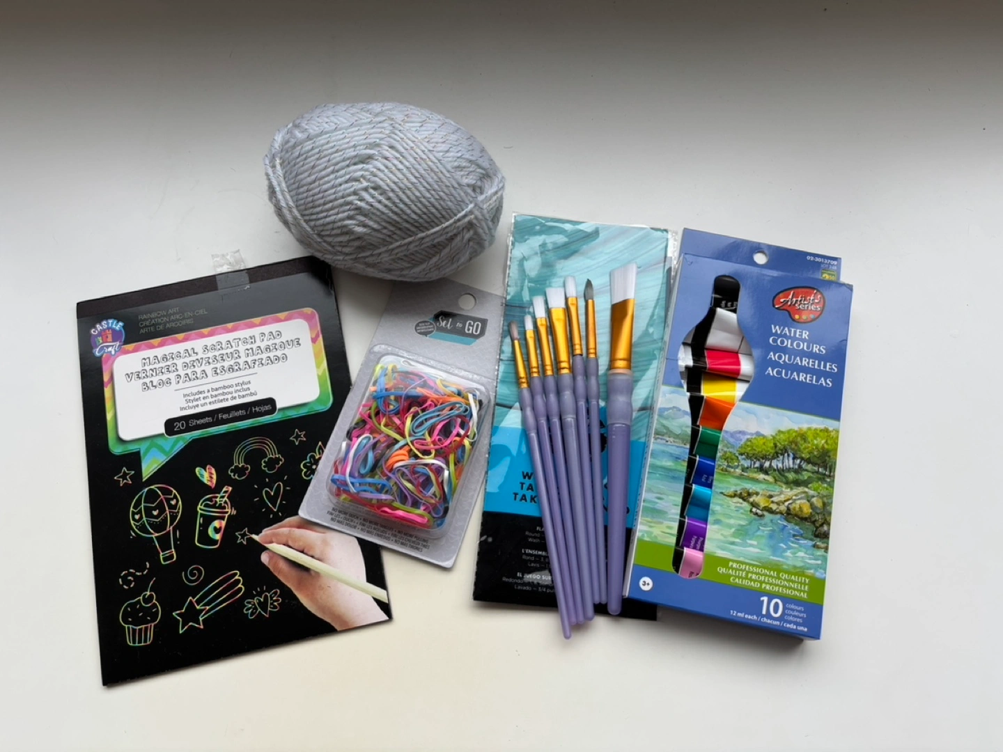 Assorted craft supplies including a set of watercolour paints, a magical scratch pad, a ball of light grey yarn, and a package of colourful hair ties. Perfect for creative projects!