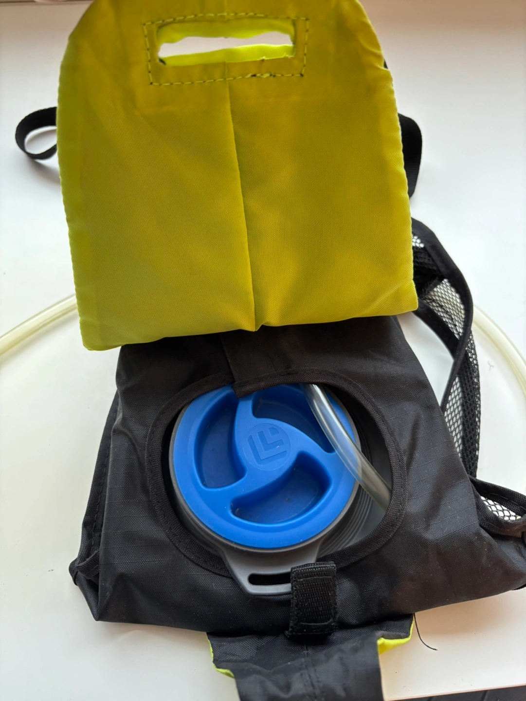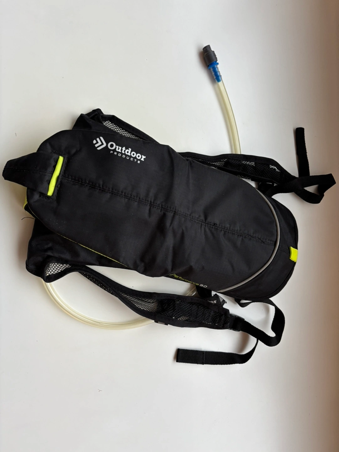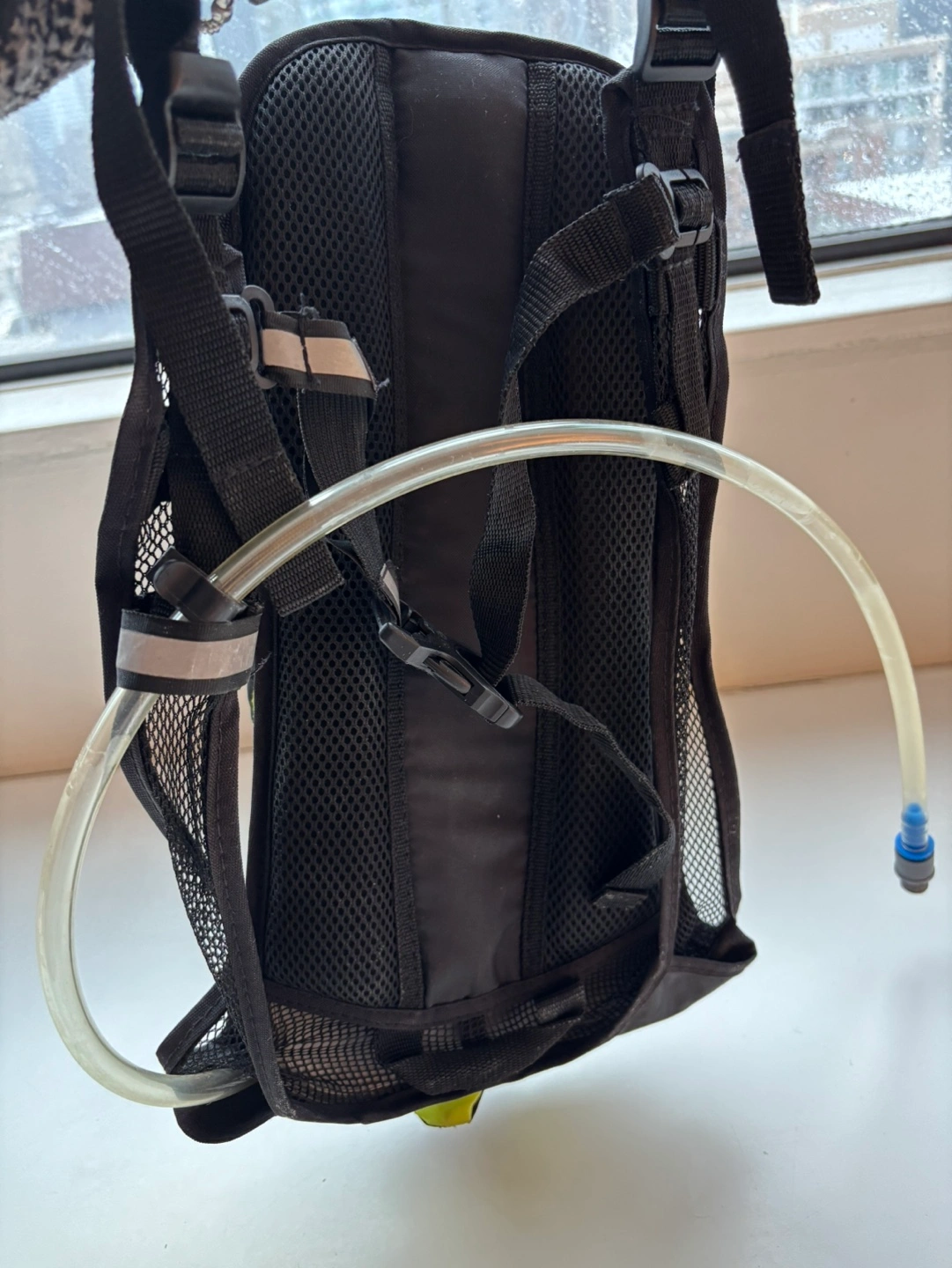 Black hydration pack with lime green accents. Features a hydration bladder and tube. Mesh back panel for breathability. Adjustable straps. Lightweight and perfect for running or cycling.