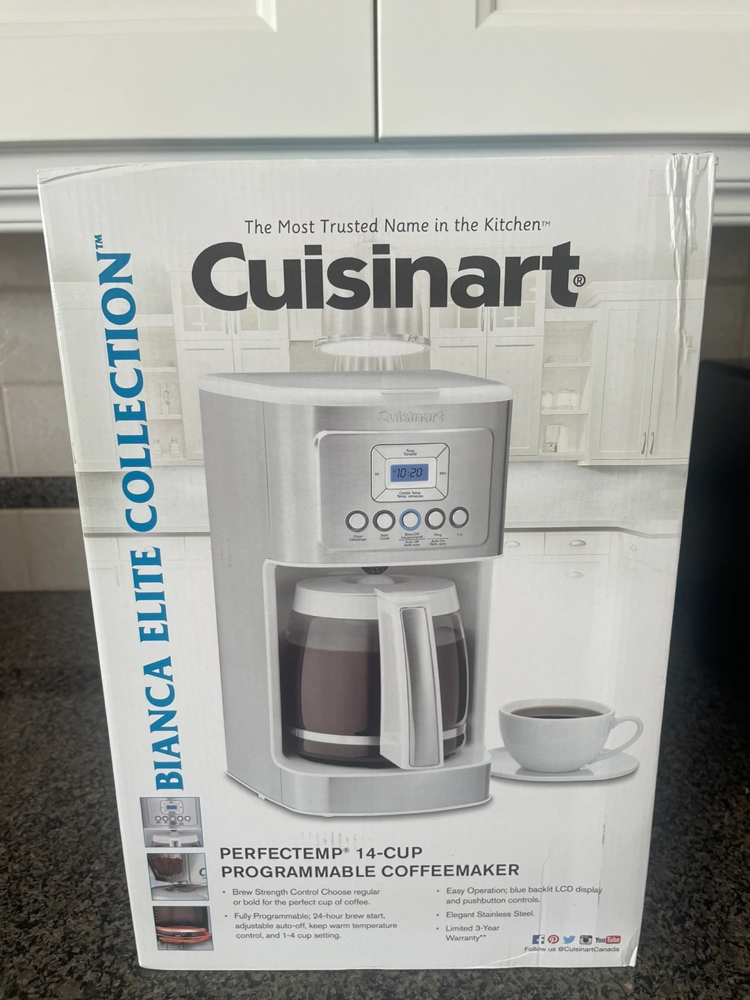TODAY receive a DISCOUNT AND A BONUS GIFT of a set of 2 WHITE COFFEE MUGS (value of 12.00) to enjoy your coffee from this great machine! Highly rated CUISINART 14 cup programable COFFEEMAKER. ***REGULAR PRICE - 189.00 - NOW ONLY 119.00*** - now ONLY 115.00 plus a BONUS GIFT Received as a gift but do not need - never out of the box. It is an elegant stainless steel easily operated with blue backlit LCD display and push button controls.