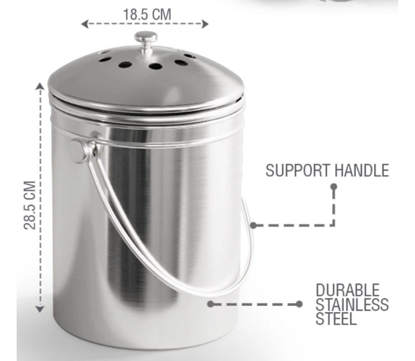 Durable stainless steel compost bin. Features a lid with air holes and a convenient carrying handle. Measures 18.5cm diameter and 28.5cm high.
