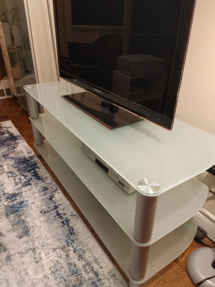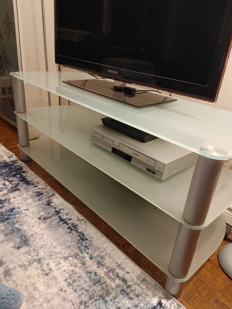Three-tiered green glass TV stand. Silver metal legs. Curved edges. Very Good condition. Good for smaller TVs.