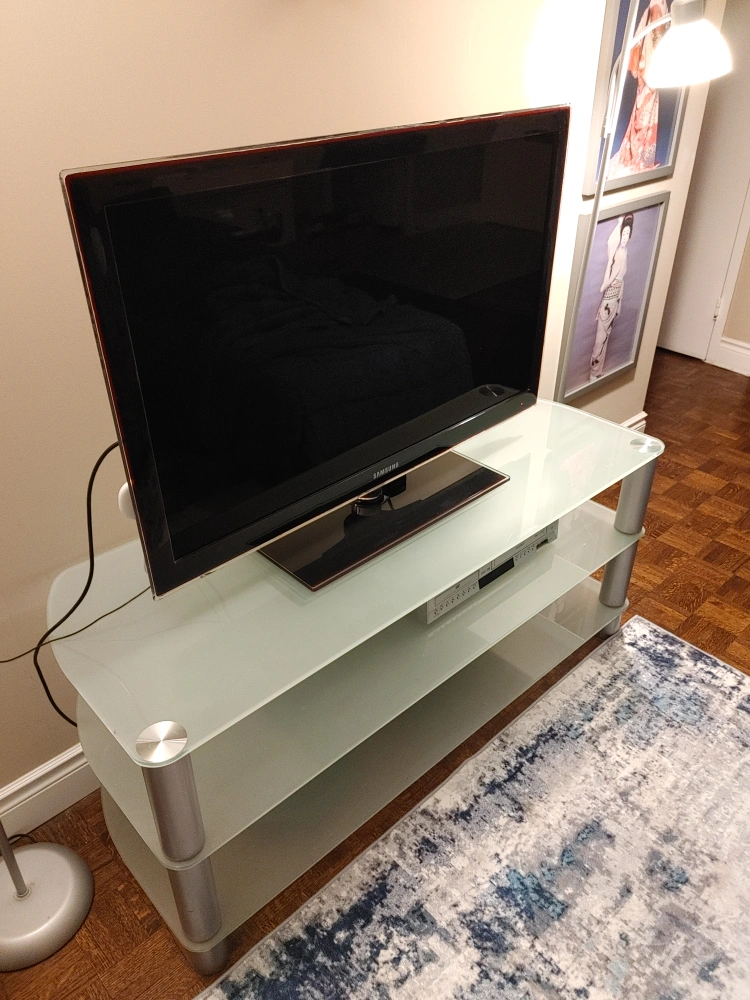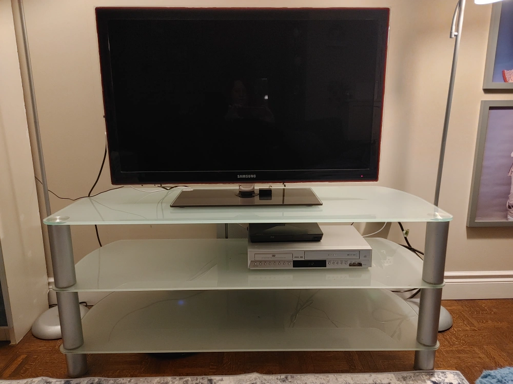 Three-tiered green glass TV stand. Silver metal legs. Curved edges. Very Good condition. Good for smaller TVs.