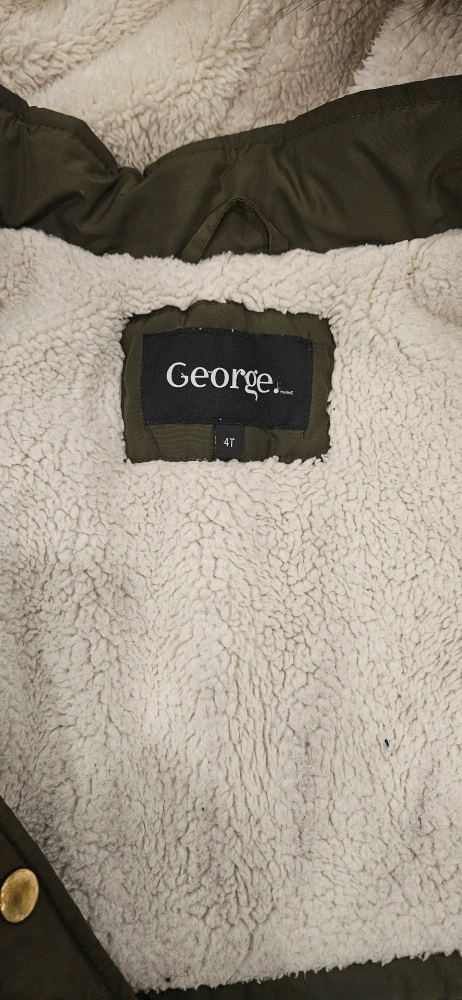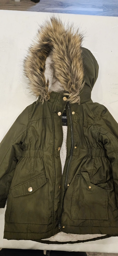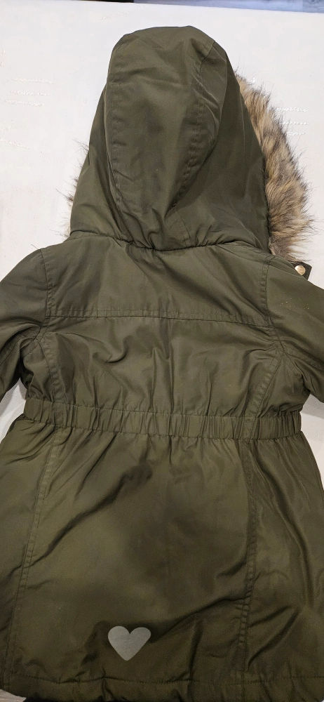 Adorable olive green winter jacket. Features a faux fur-trimmed hood and warm fleece lining. Size 4T Great for cold weather.