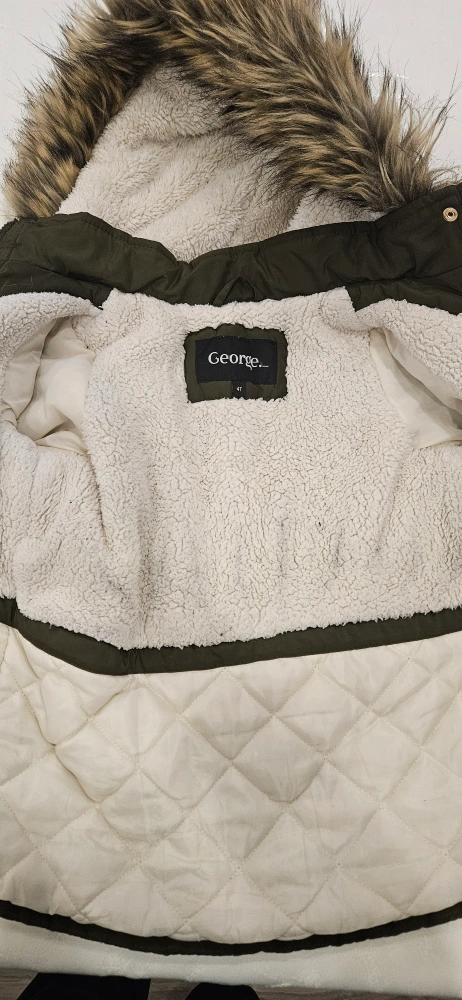 Adorable olive green winter jacket. Features a faux fur-trimmed hood and warm fleece lining. Size 4T Great for cold weather.